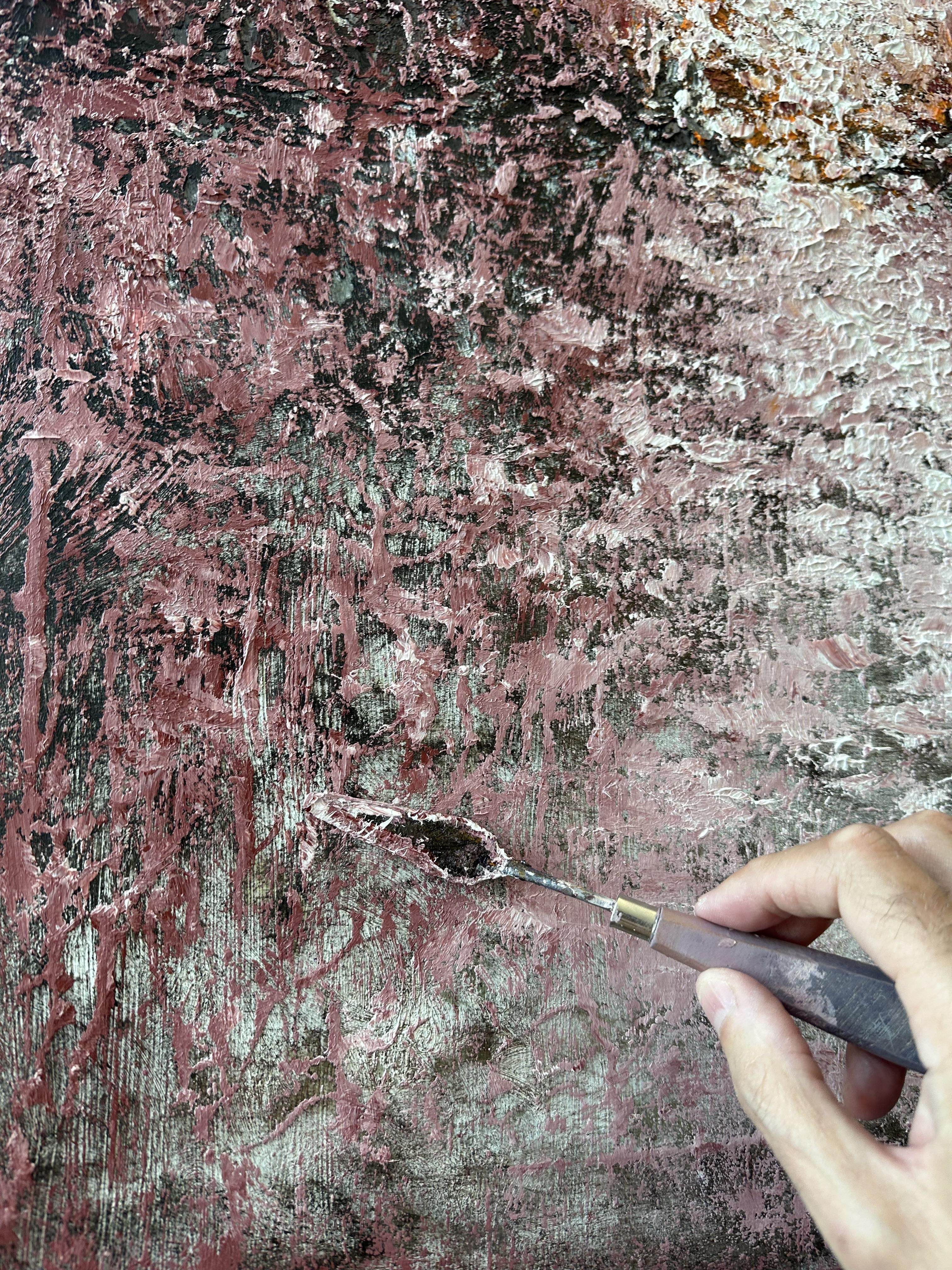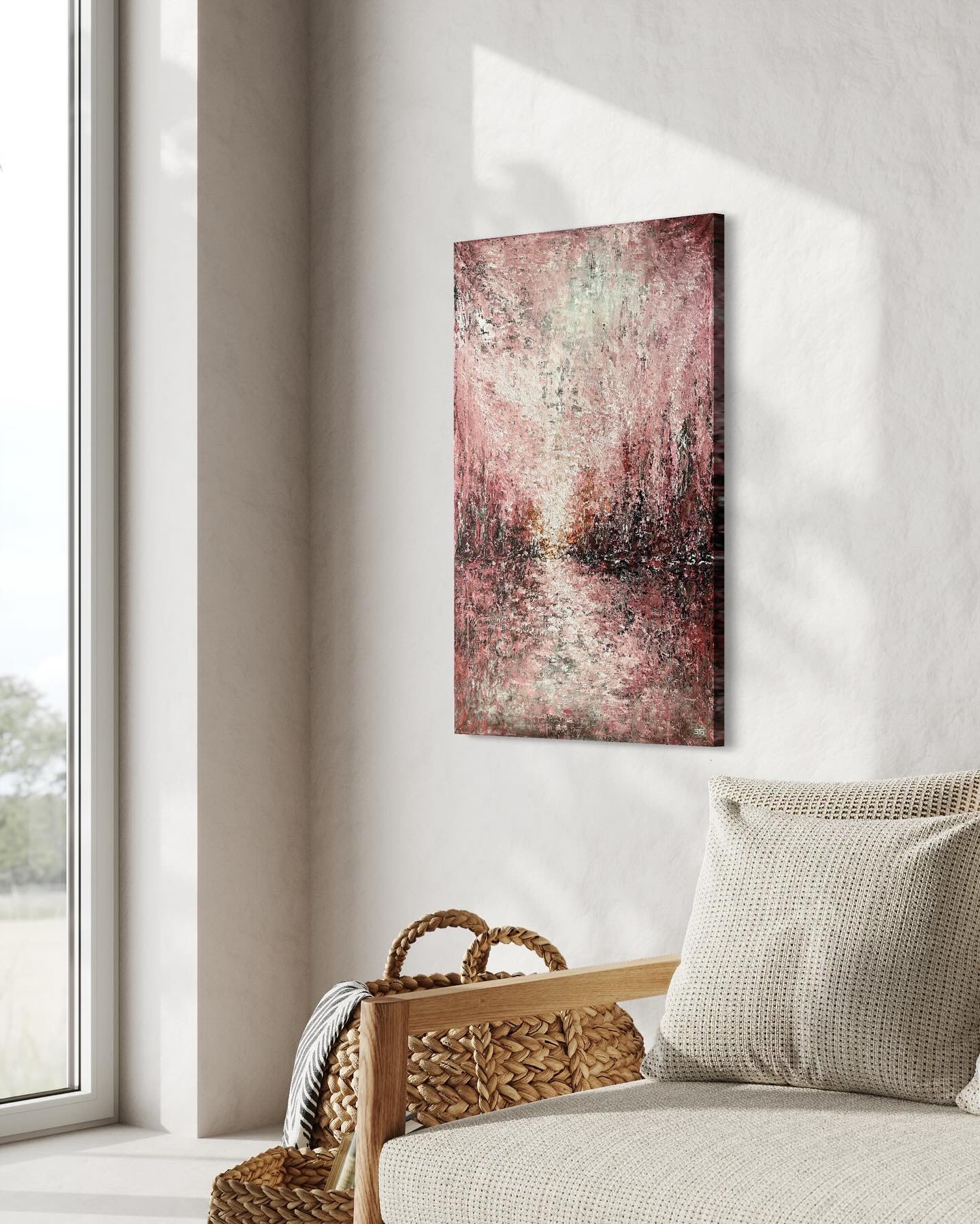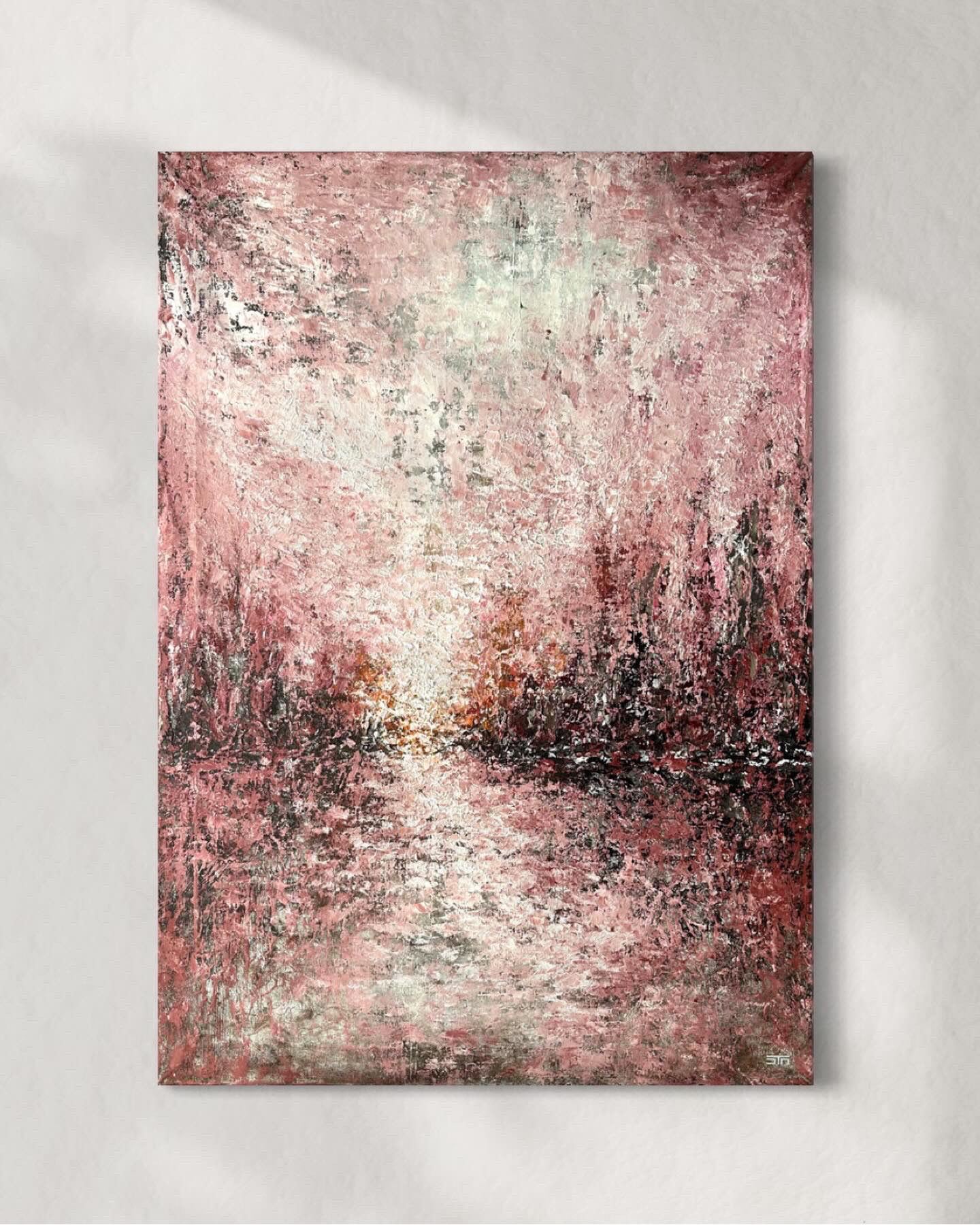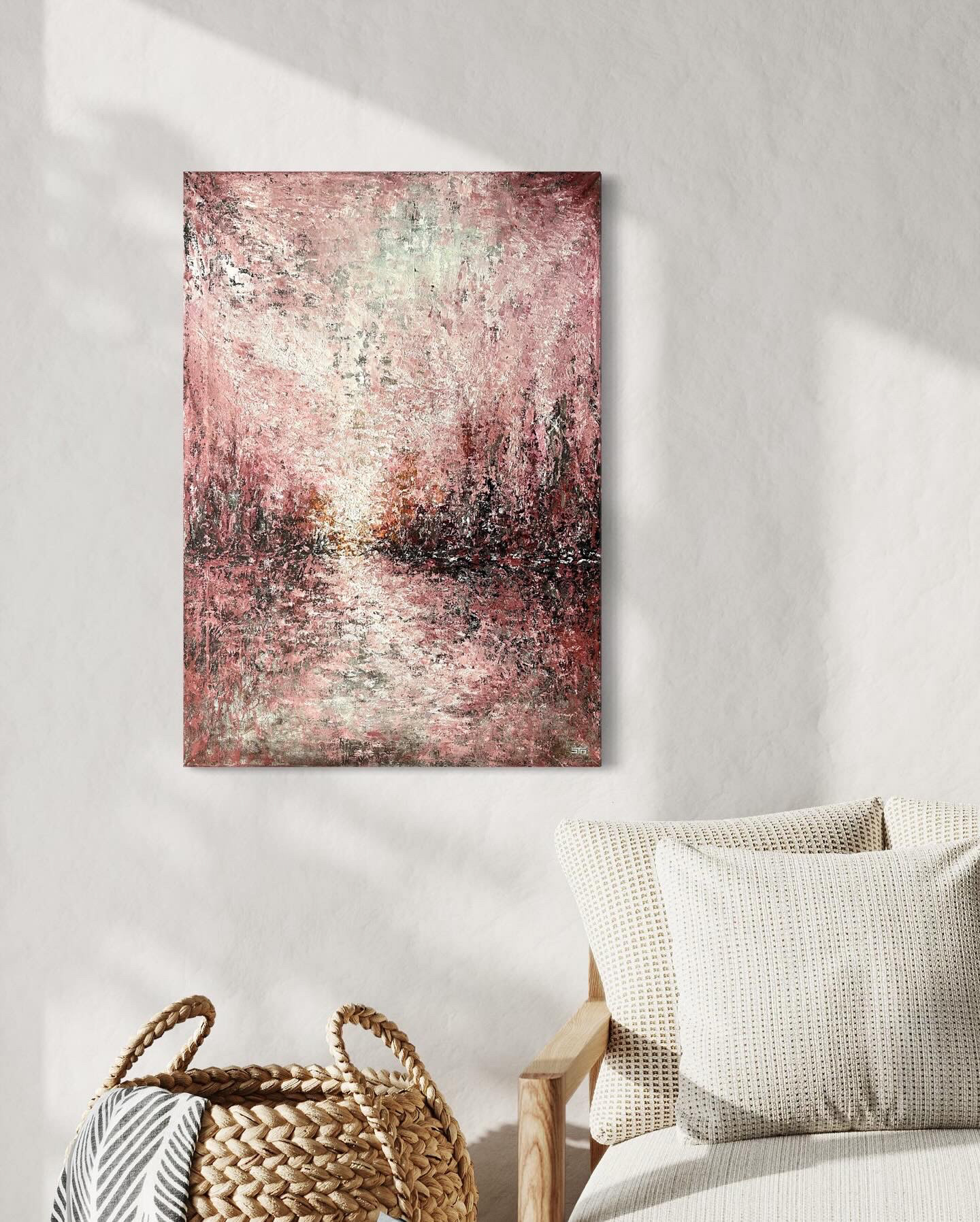 De grove, intense strøg fra spartlen skaber et taktilt og råt landskab, der i mødet med de blide rosa nuancer skaber en spændende kontrast og dobbelthed. Mod horisonten ser vi et lys – et håb, der leder os fremad og videre ...