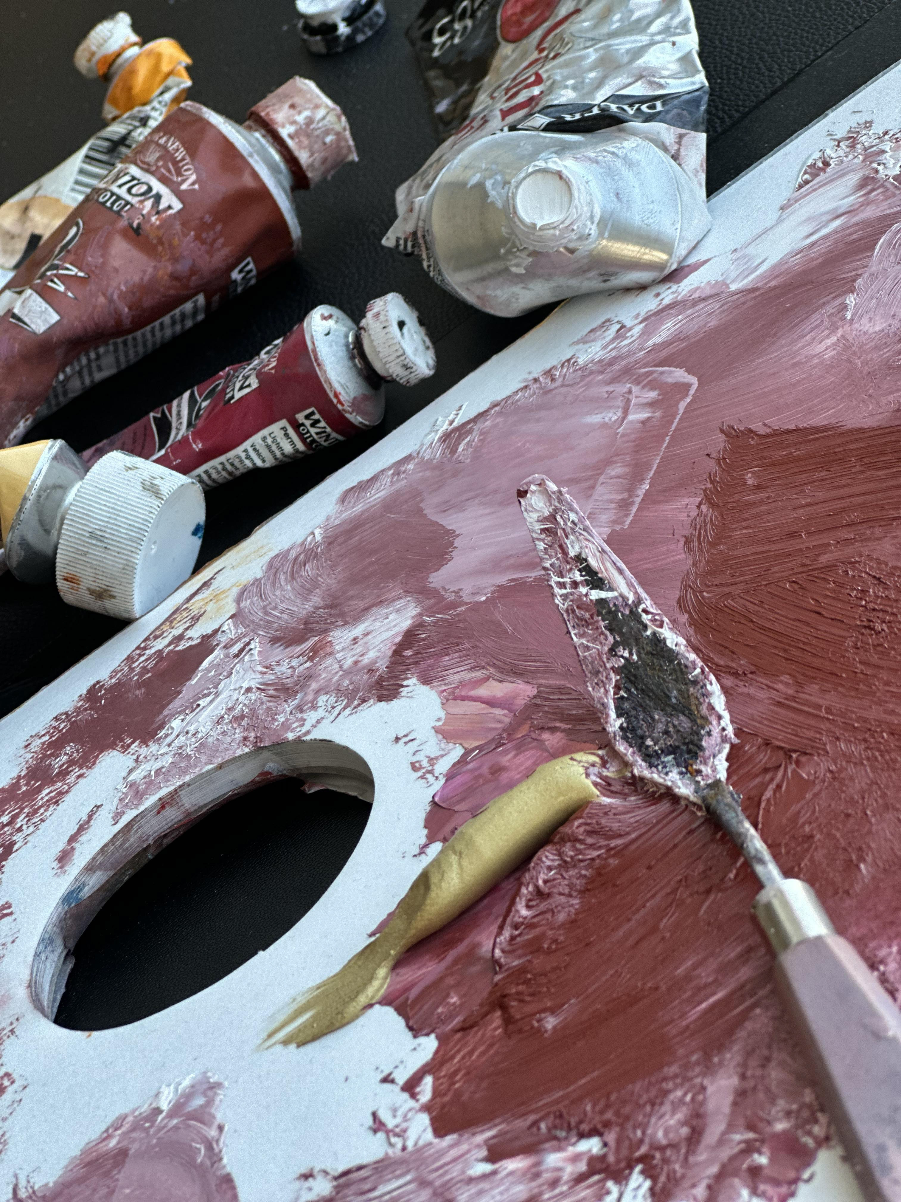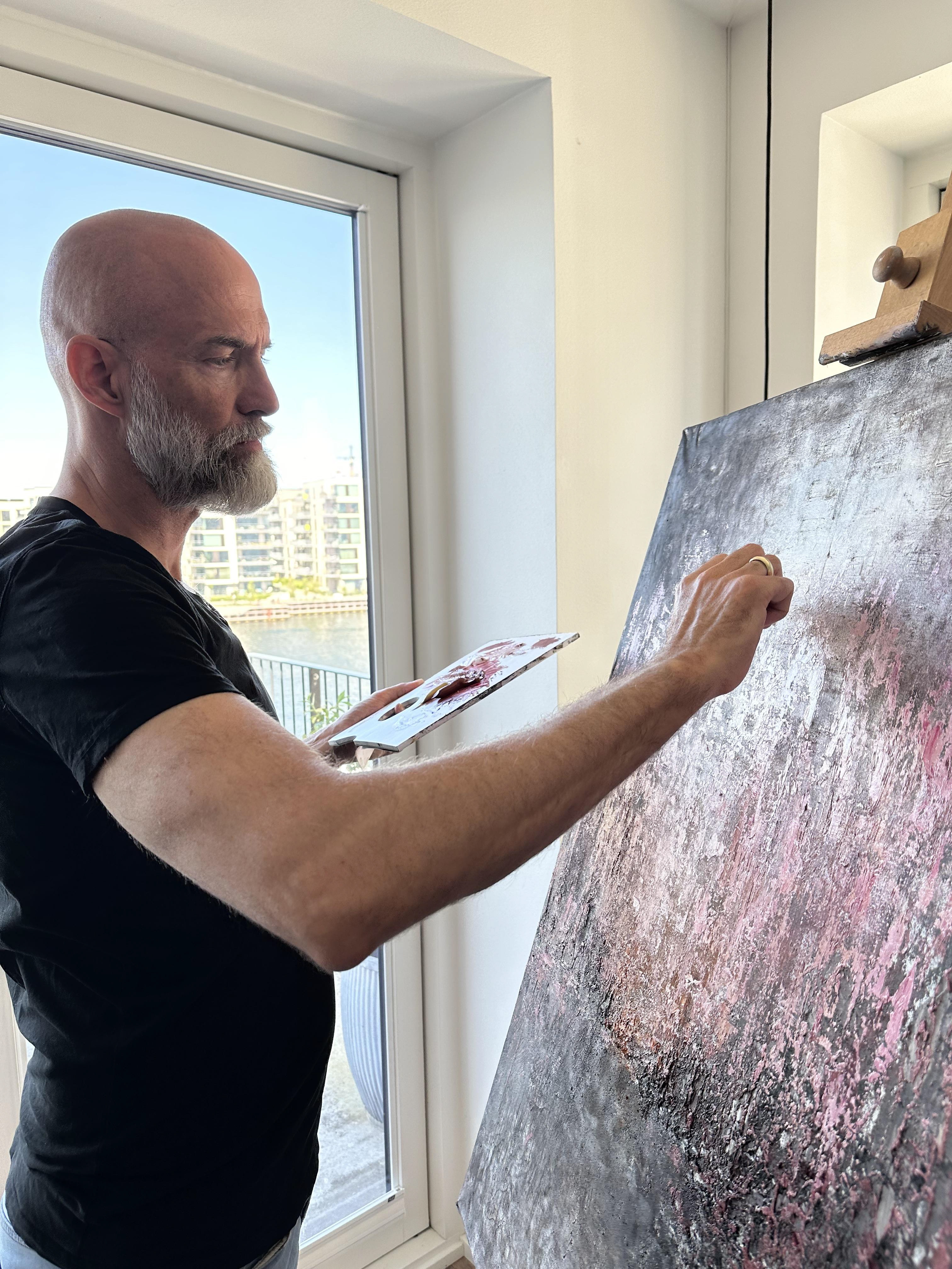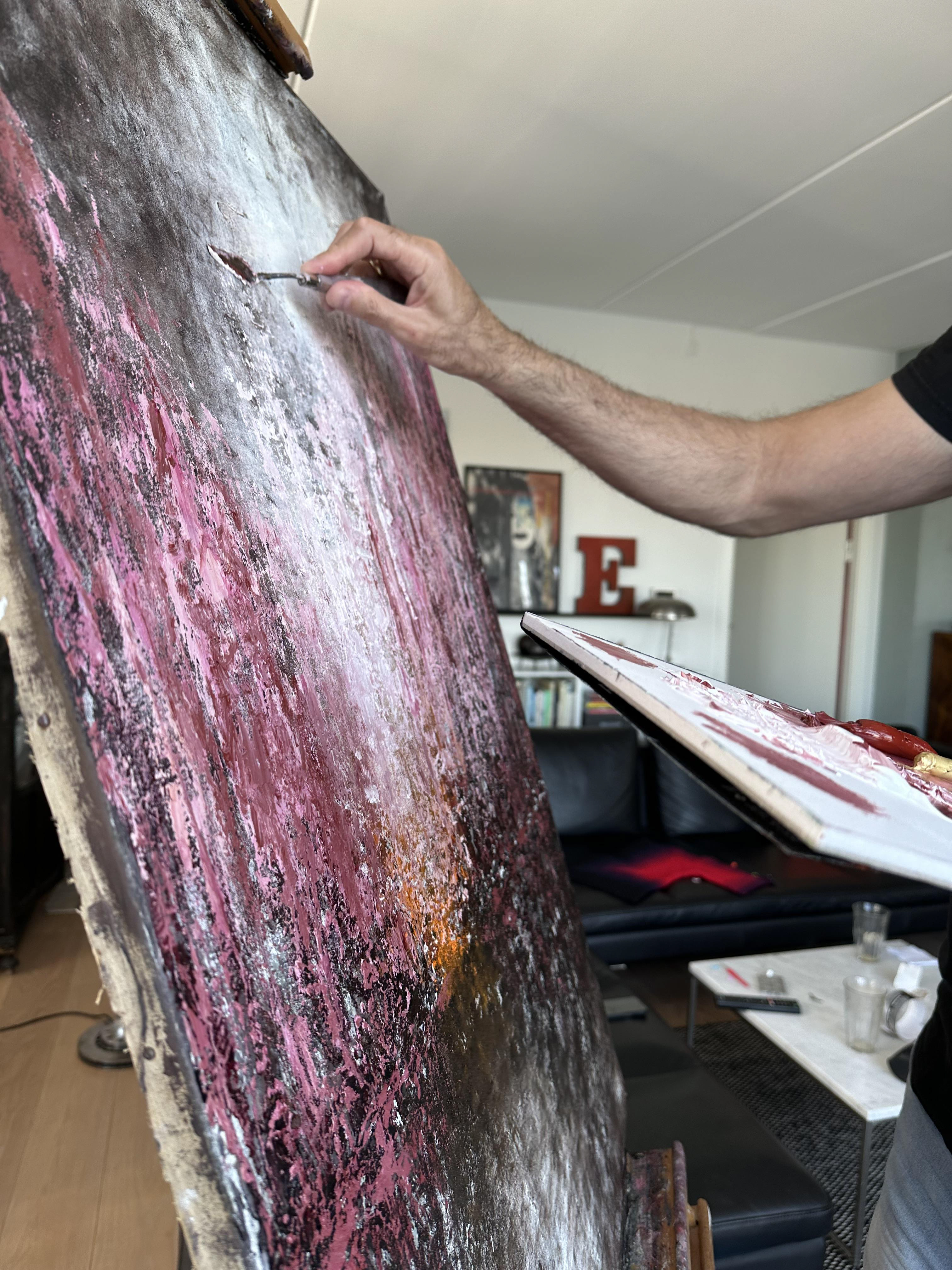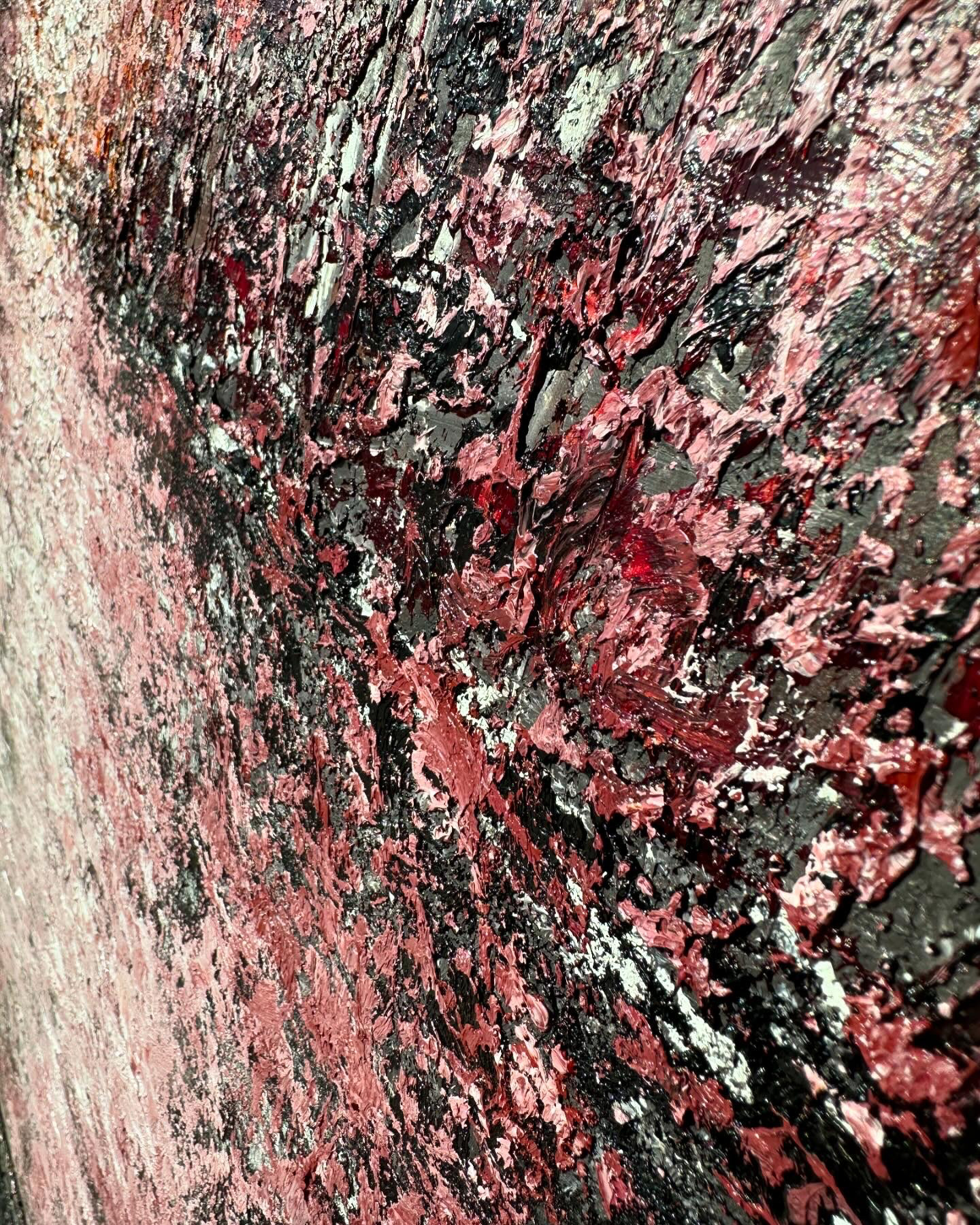 De grove, intense strøg fra spartlen skaber et taktilt og råt landskab, der i mødet med de blide rosa nuancer skaber en spændende kontrast og dobbelthed. Mod horisonten ser vi et lys – et håb, der leder os fremad og videre ...
