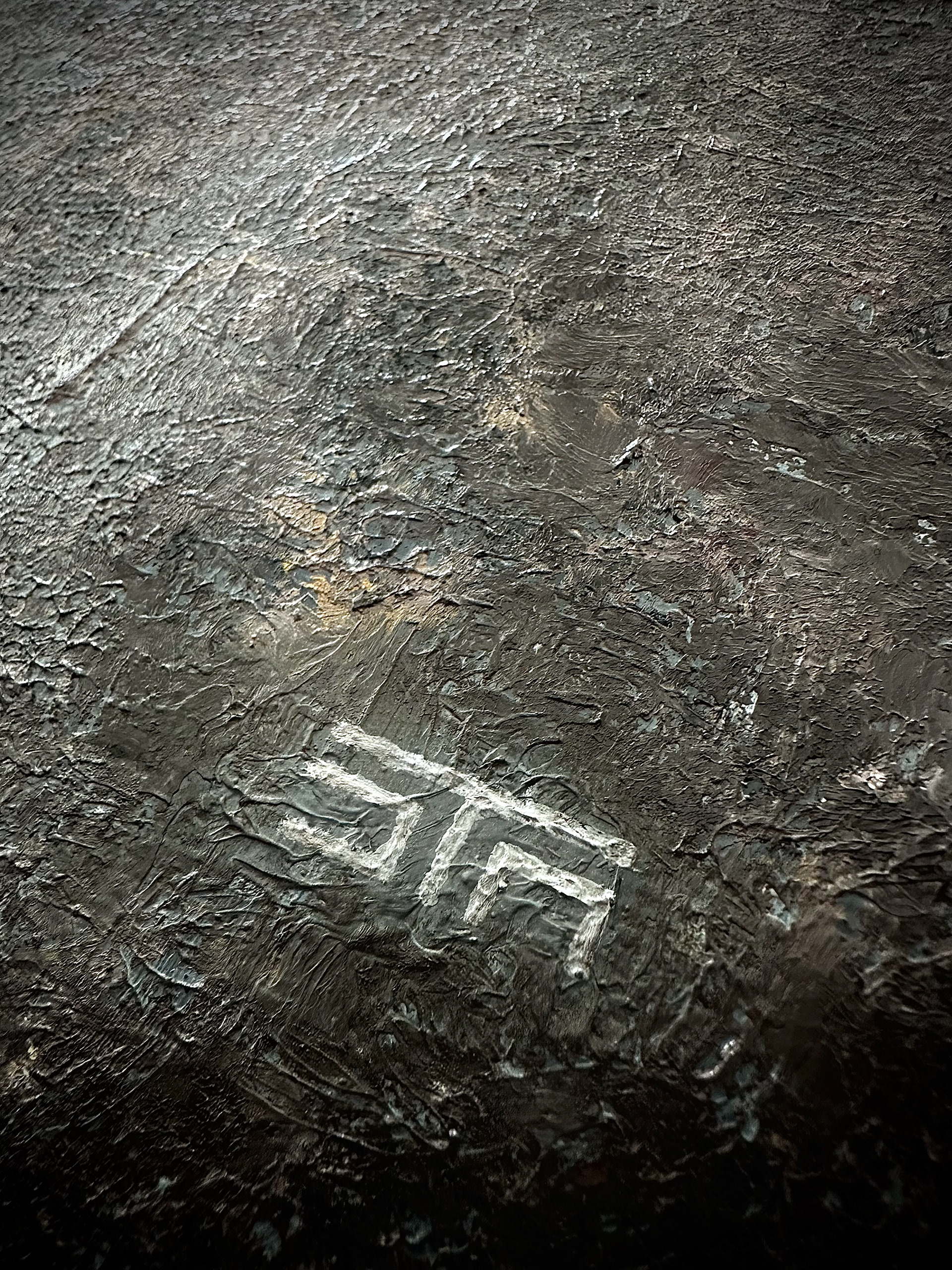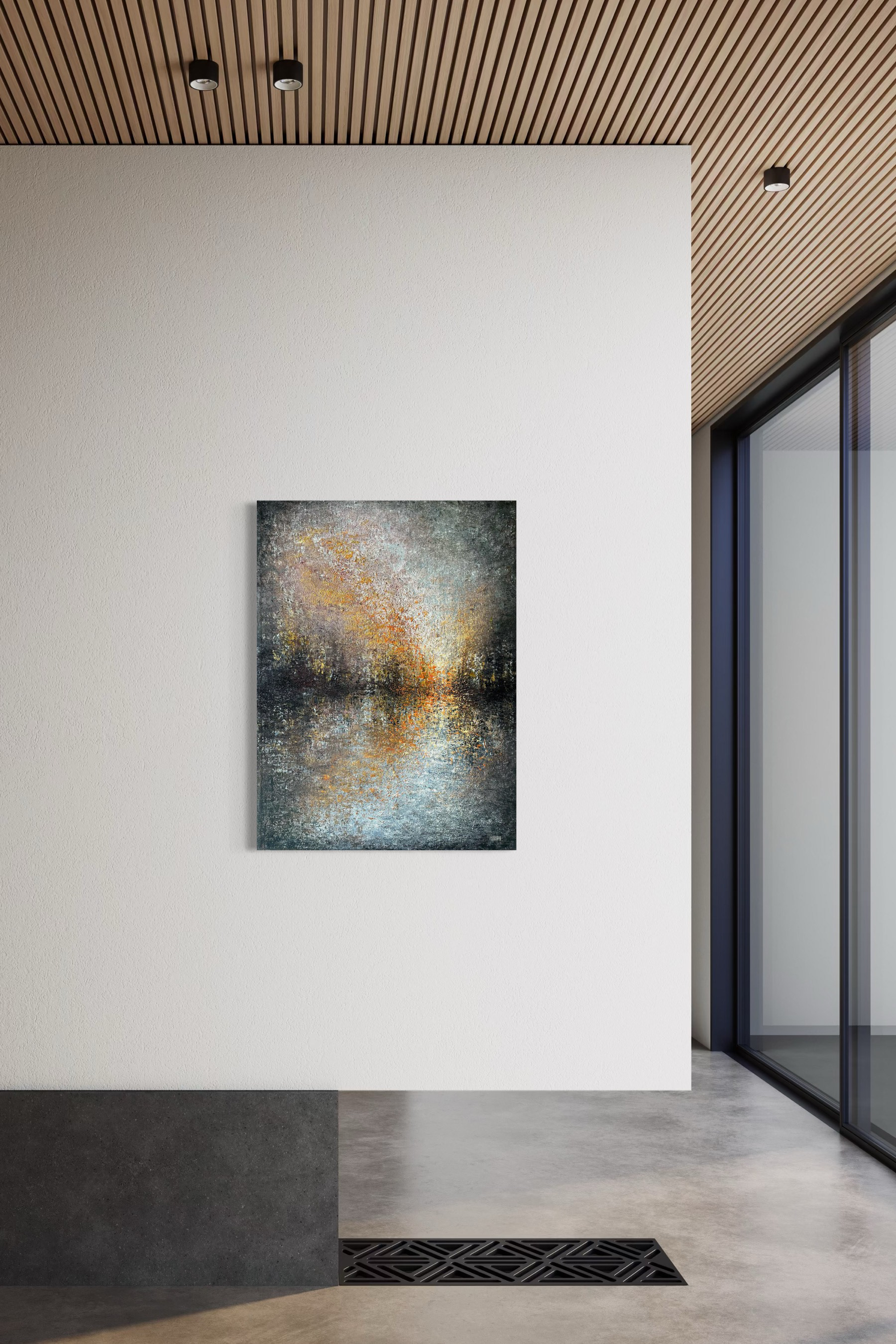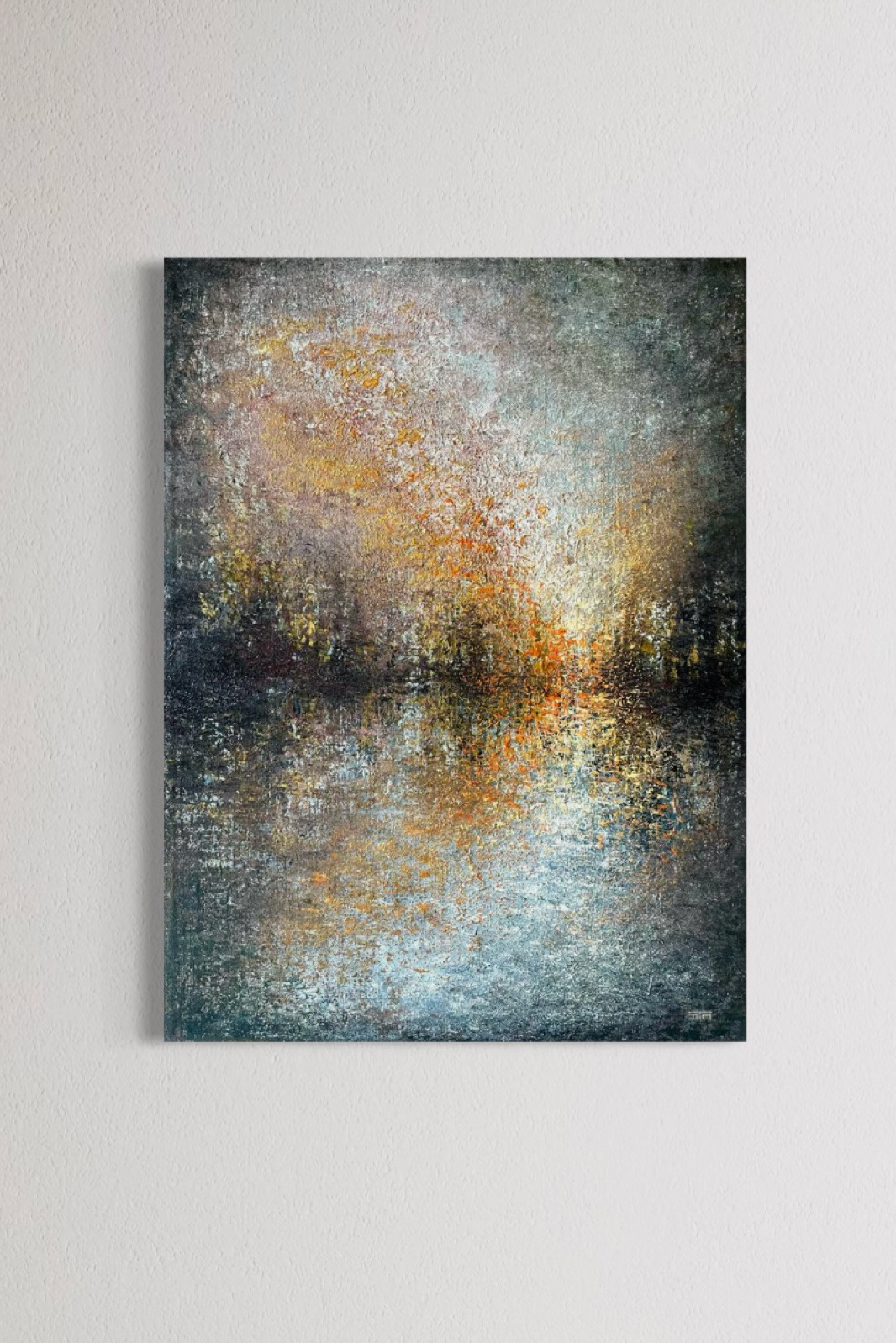 Et gammelt motiv udvikler sig igen og igen. Genbesøgt, videreudviklet og forvandlet med endnu et lag maling. Et landskab af gråbrune og gyldne nuancer, hvor himmel og hav smelter til ét. Som et ekko af den rejse og udvikling, jeg som kunstner og menneske selv er på.