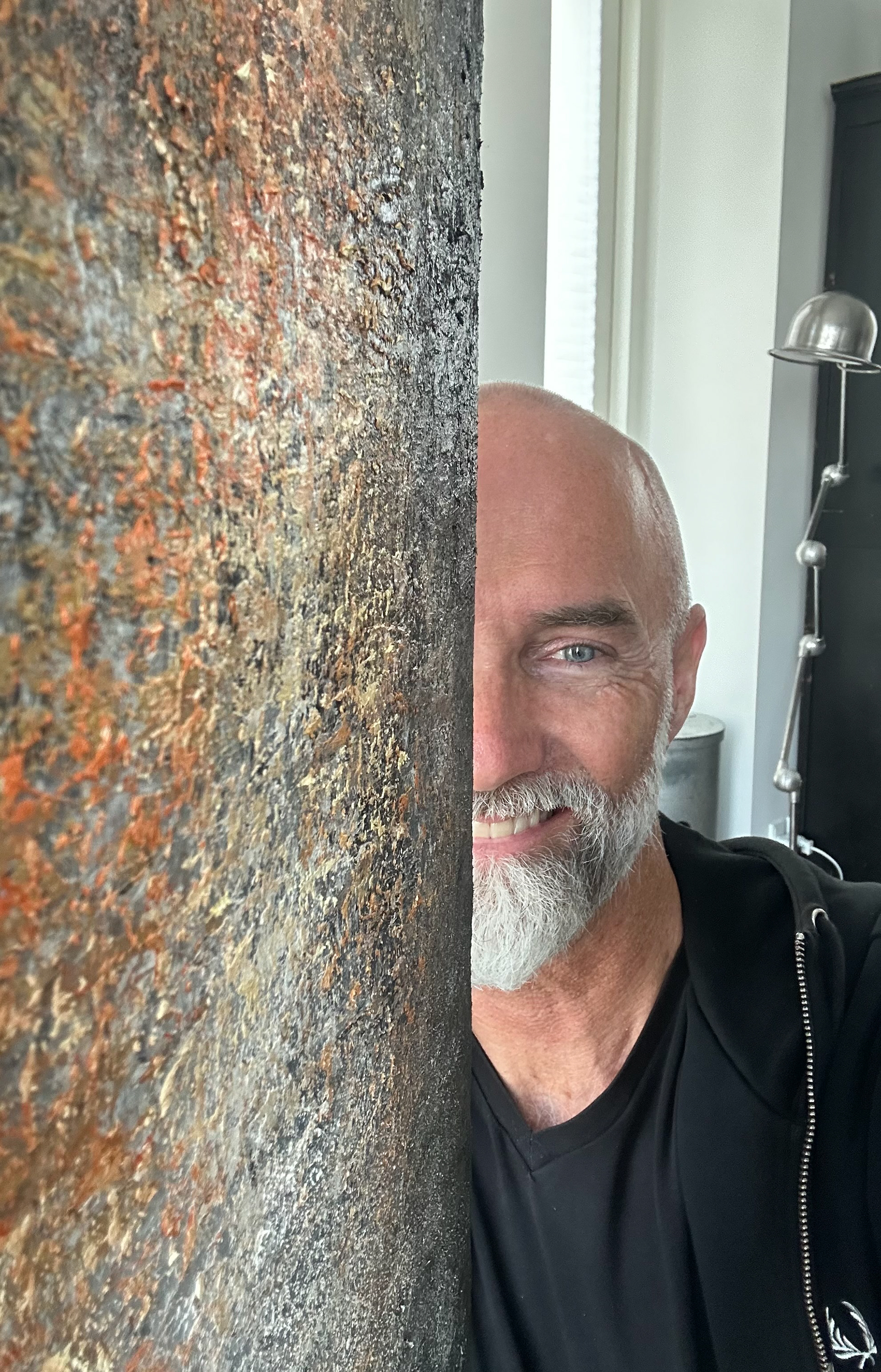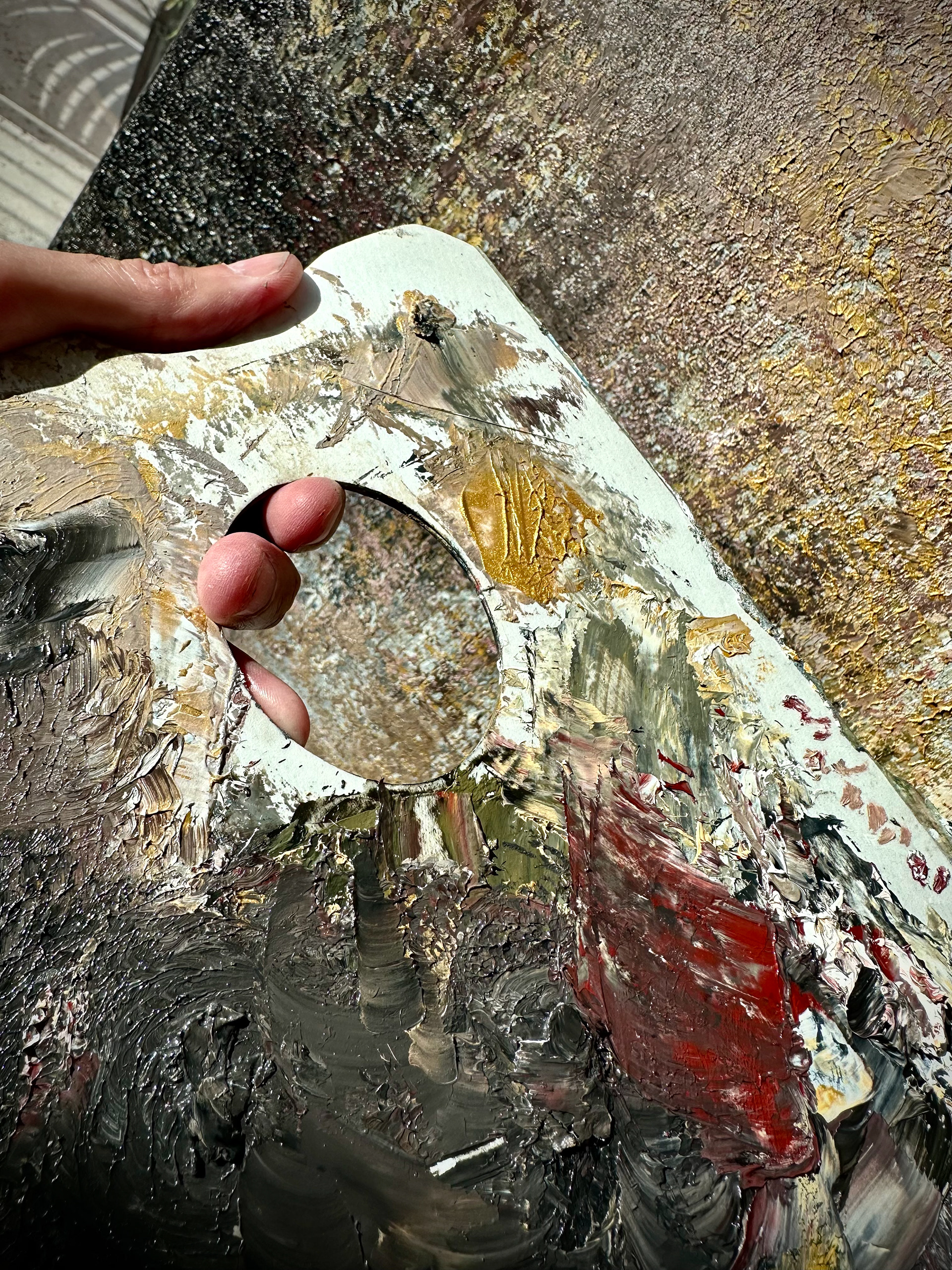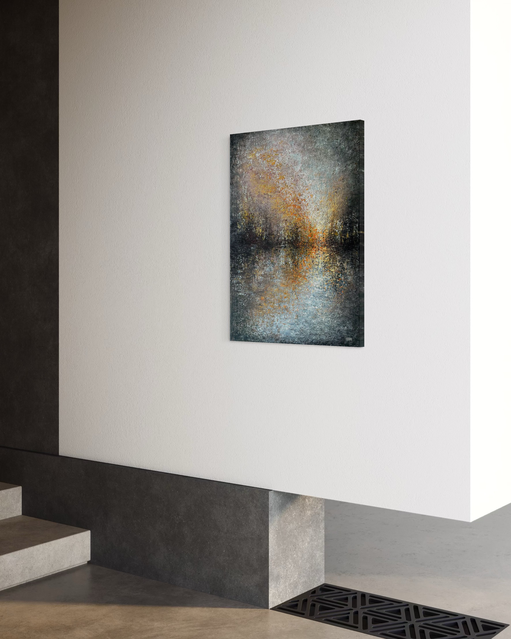 Et gammelt motiv udvikler sig igen og igen. Genbesøgt, videreudviklet og forvandlet med endnu et lag maling. Et landskab af gråbrune og gyldne nuancer, hvor himmel og hav smelter til ét. Som et ekko af den rejse og udvikling, jeg som kunstner og menneske selv er på.