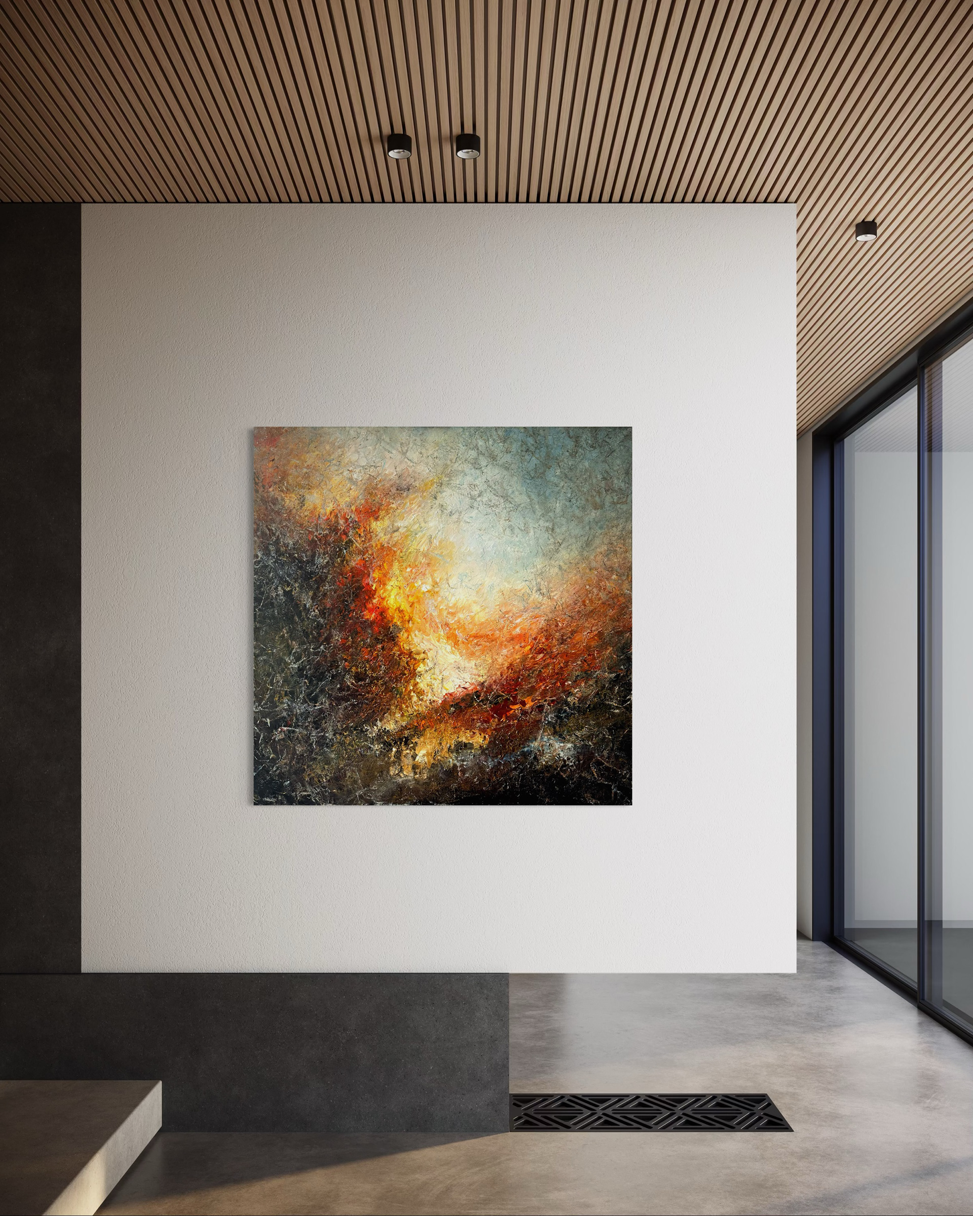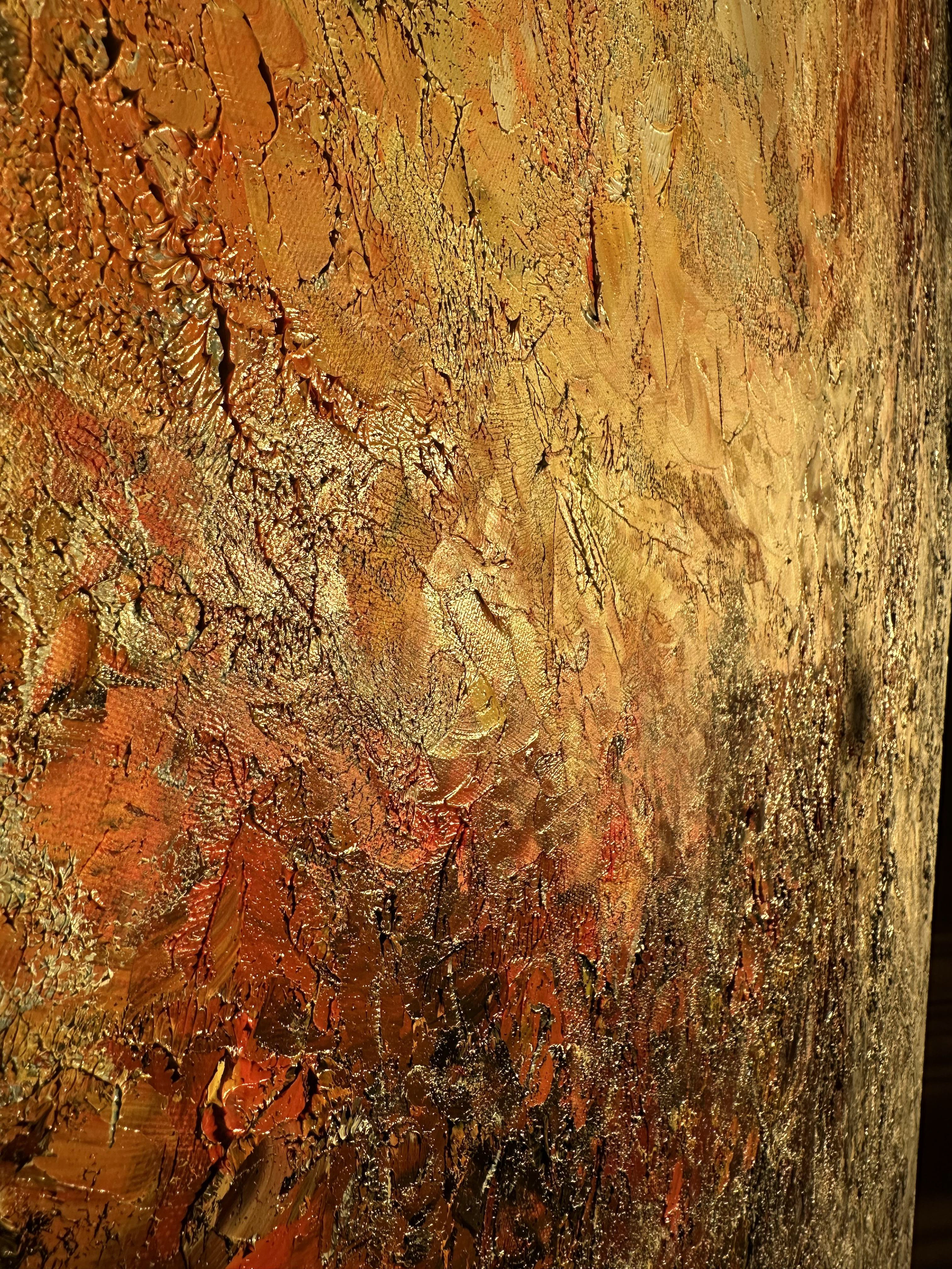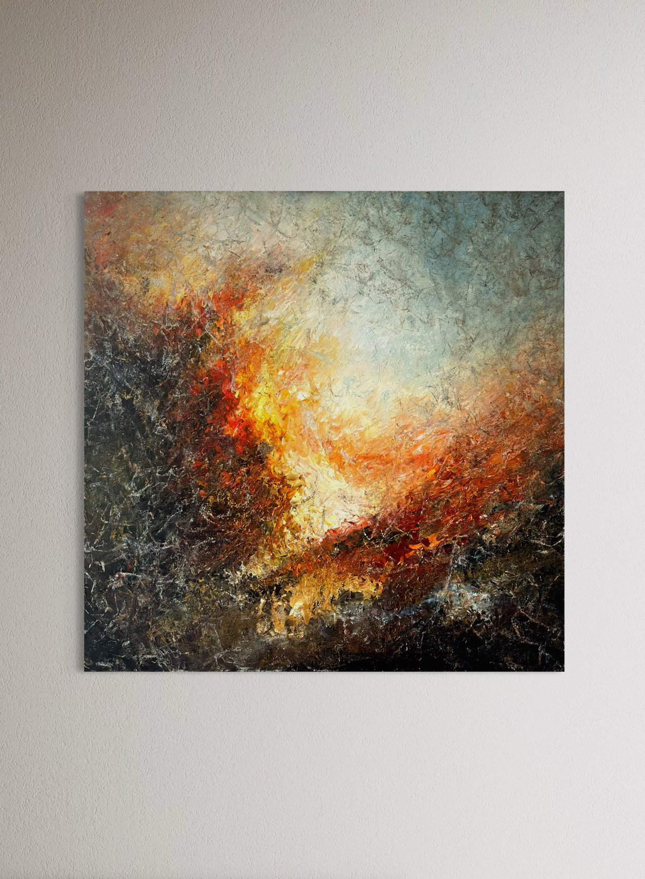 Gule, orange og dybrøde lag smelter sammen i et vildt udbrud, som en solnedgang der brænder sig ind i horisonten. Himmel og hav opløses i glødende skær, mens dagen ånder ud i flammer af lys.