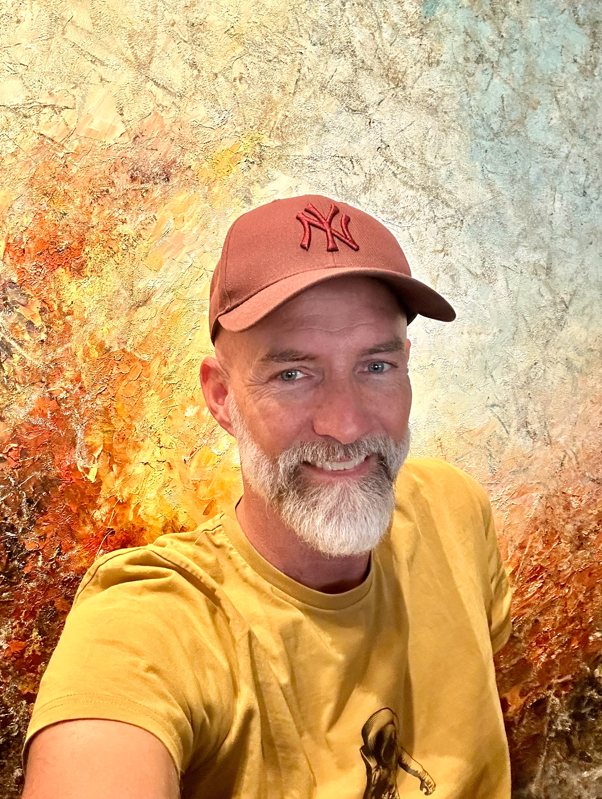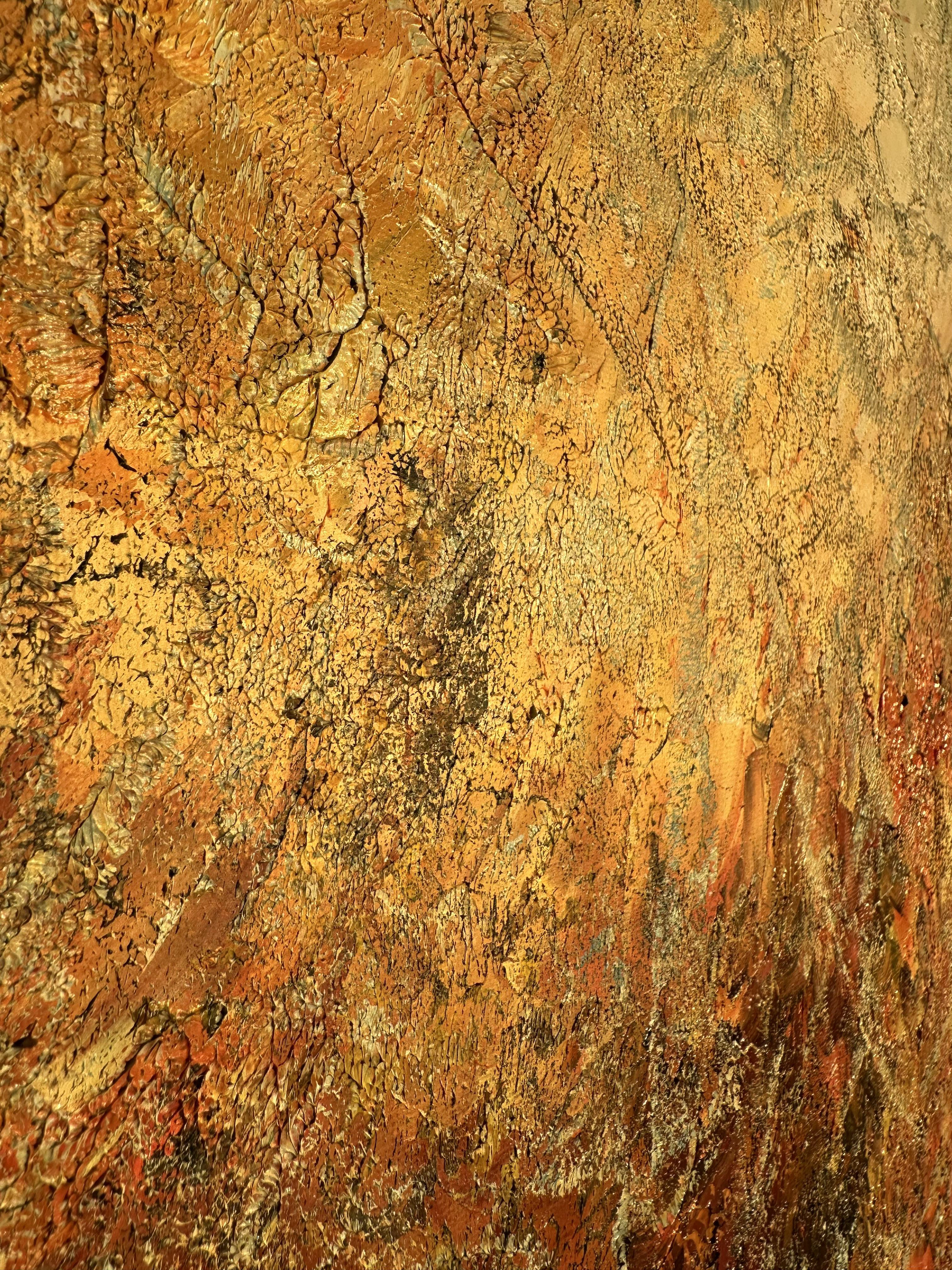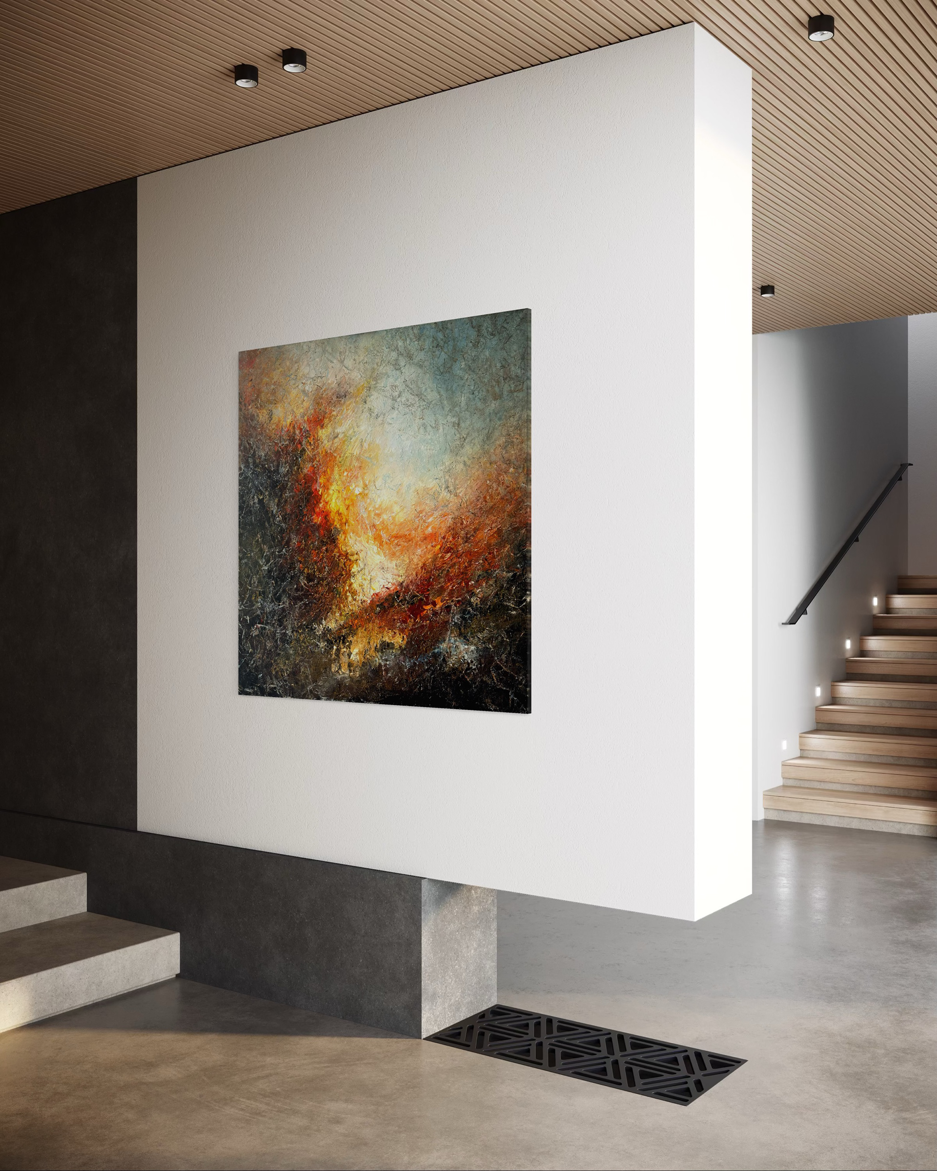 Gule, orange og dybrøde lag smelter sammen i et vildt udbrud, som en solnedgang der brænder sig ind i horisonten. Himmel og hav opløses i glødende skær, mens dagen ånder ud i flammer af lys.