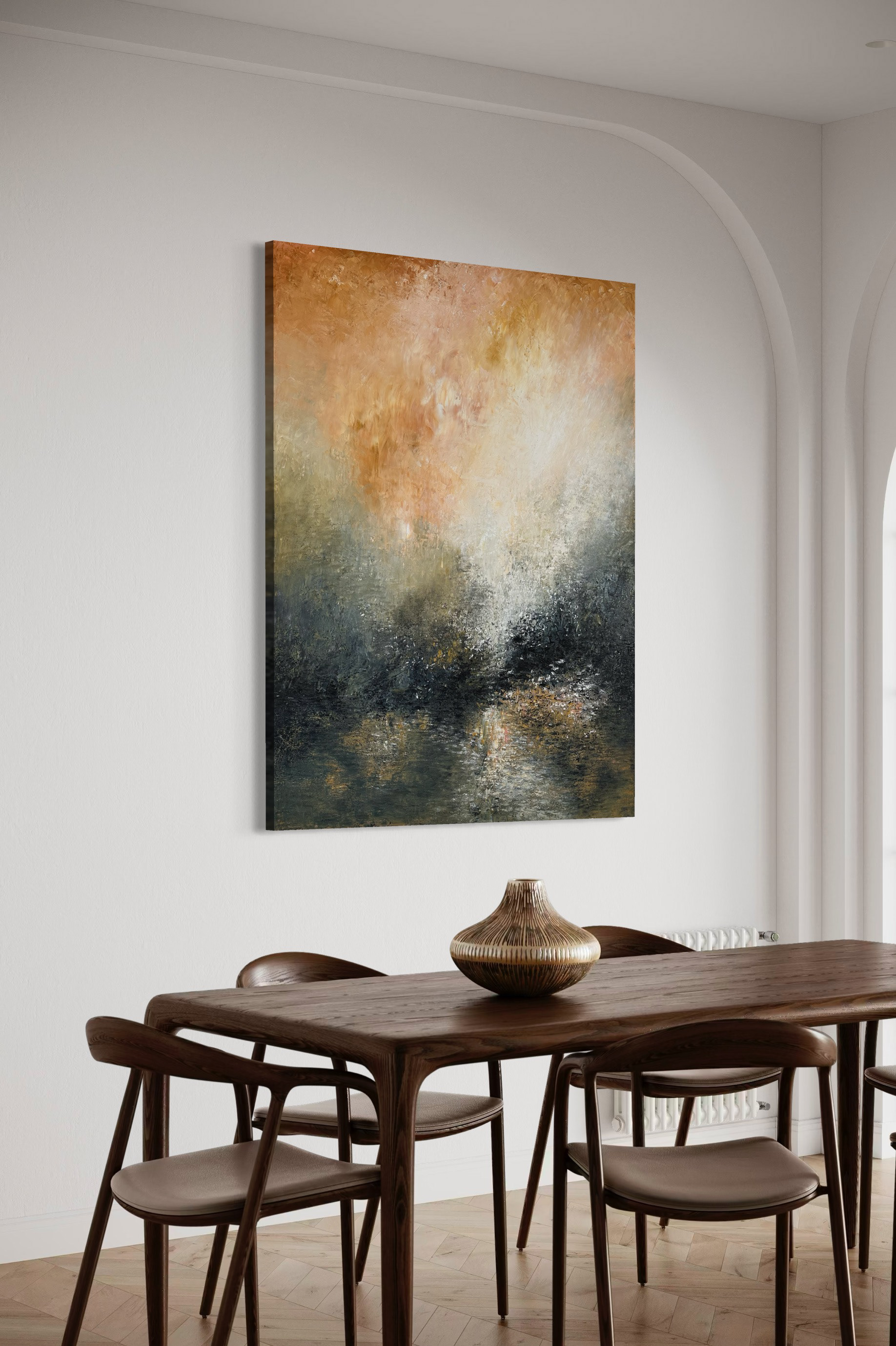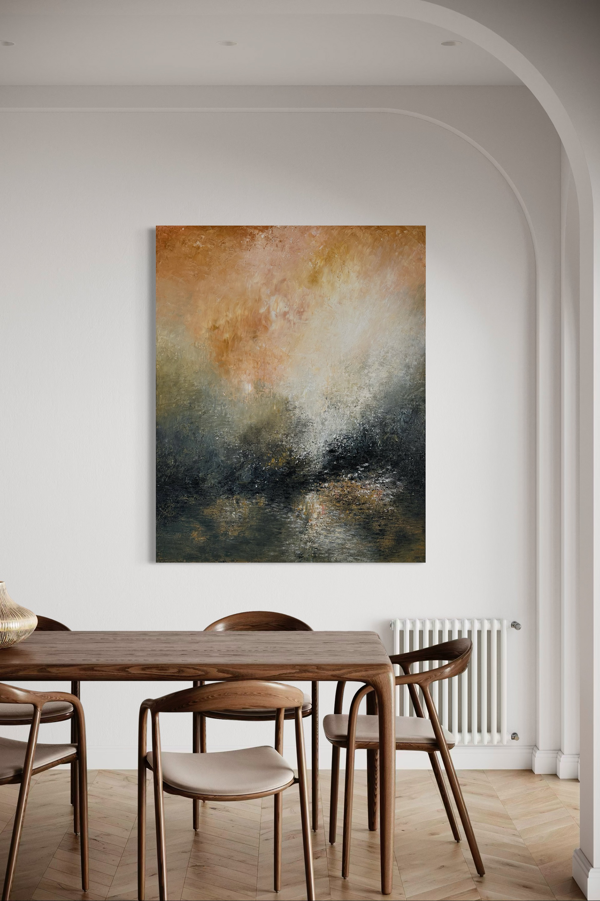 Et lys vokser mellem skovens mørke og himlens brand. Det finder genklang i vandets spejl og åbner sig som tvetydig skønhed. Et stor maleri, der ikke blot skildrer lys – men bringer det ind i rummet.