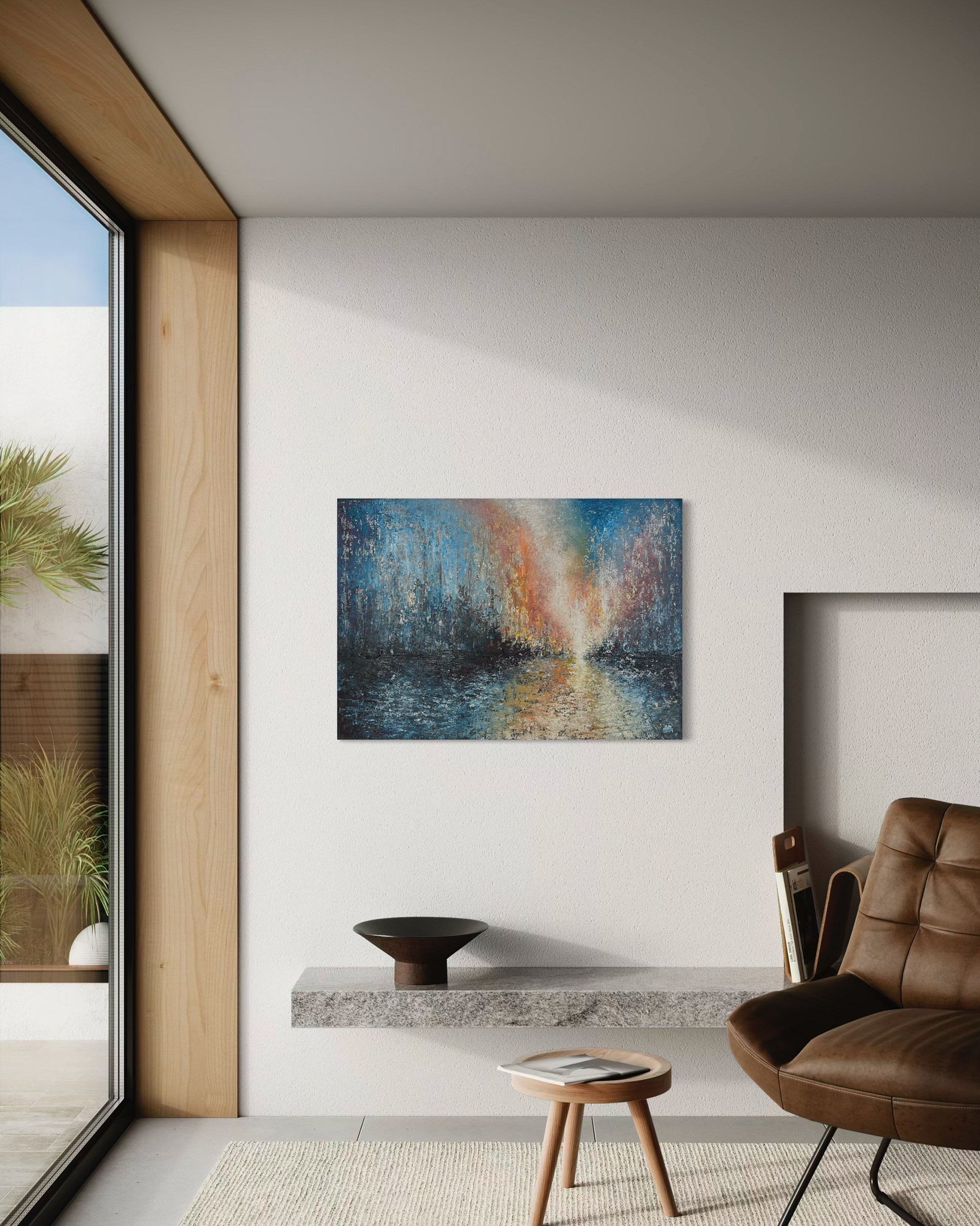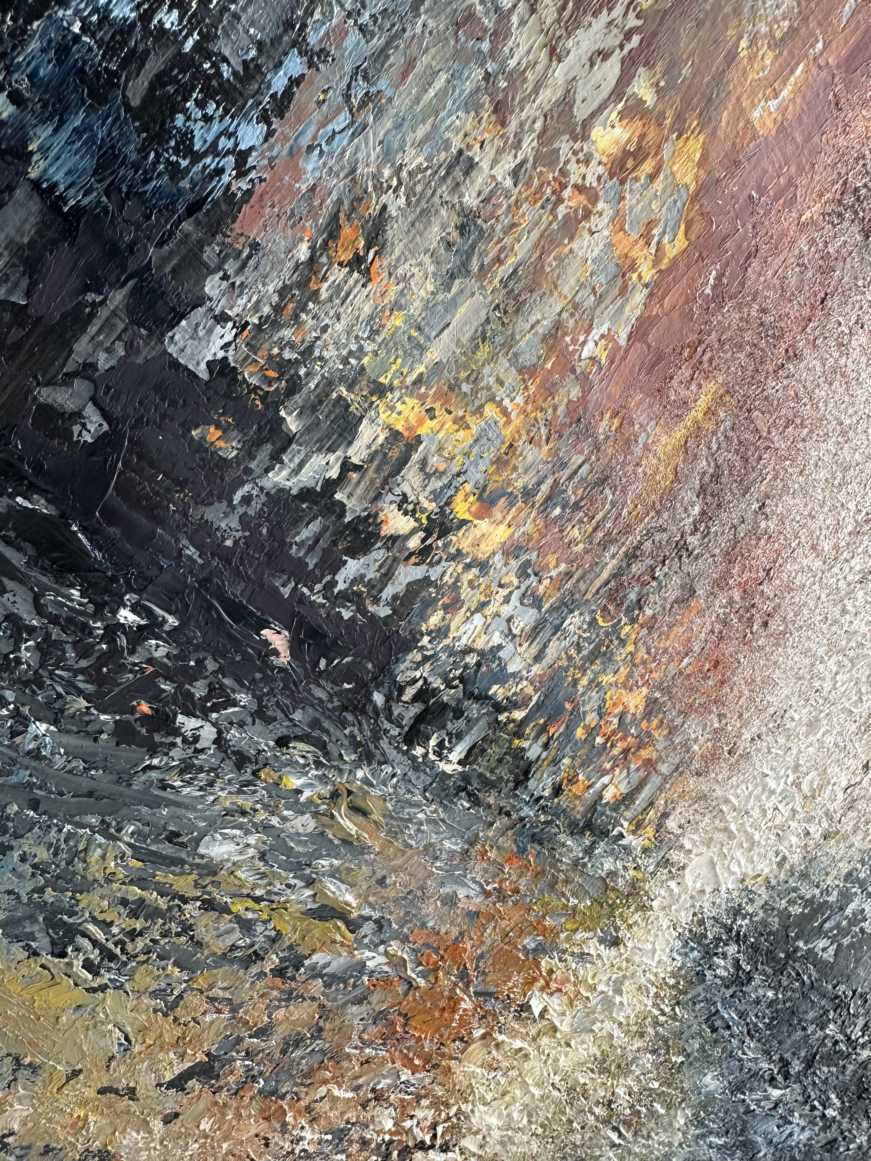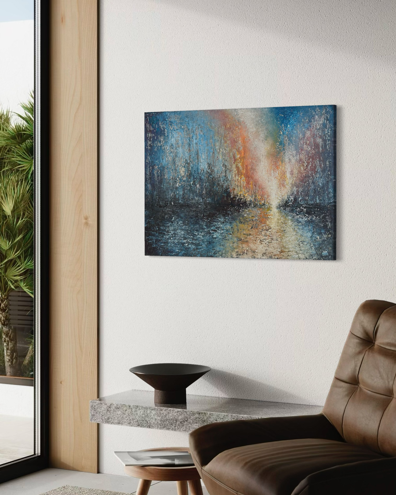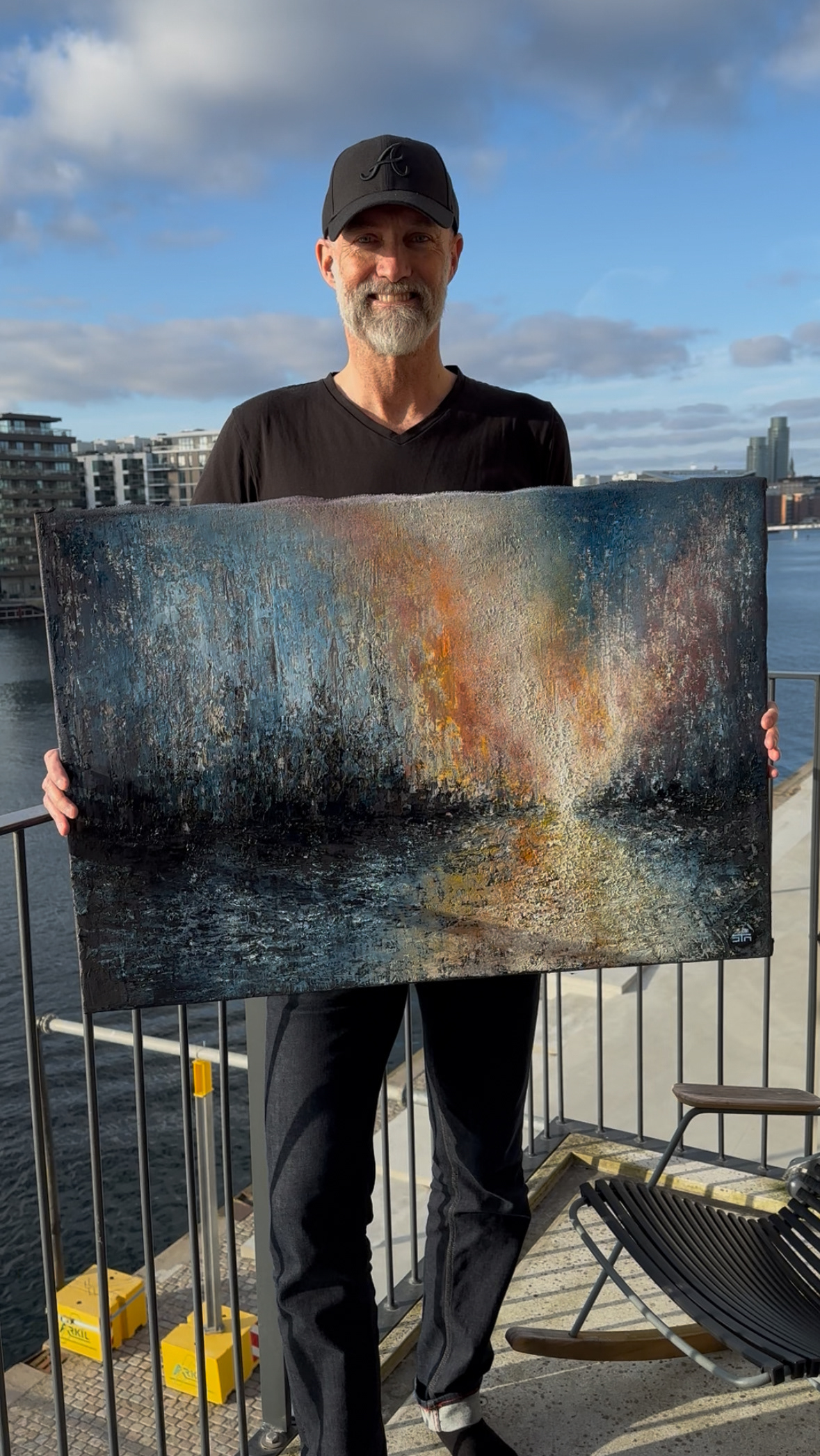 Et maleri der var længe undervejs – lag på lag, omformet og afprøvet, indtil det fandt sin vej. Motivet ligger dybt i mig. Det er en følelse og et billede på drømme og længsler, bevægelse og forandring.
