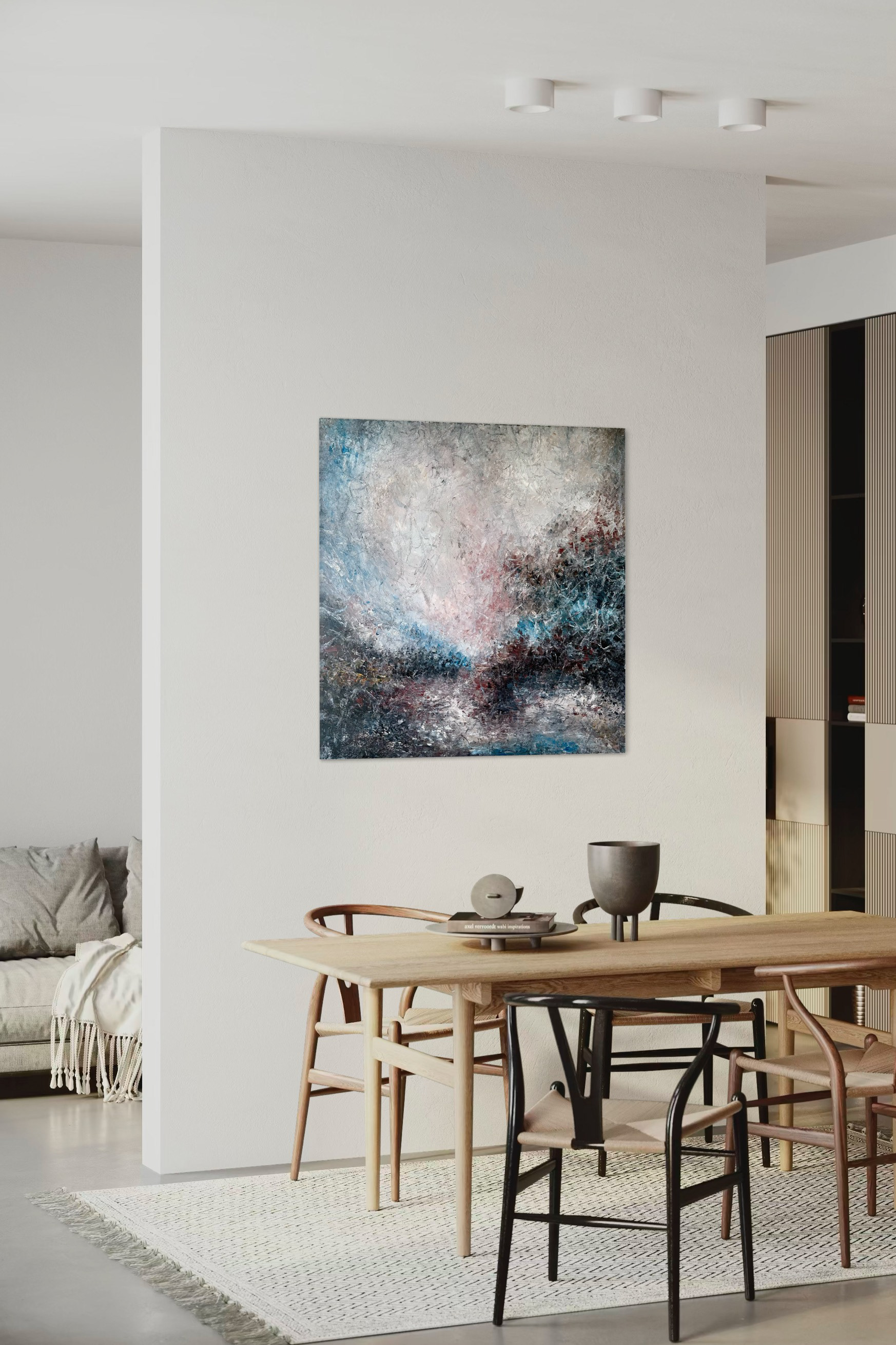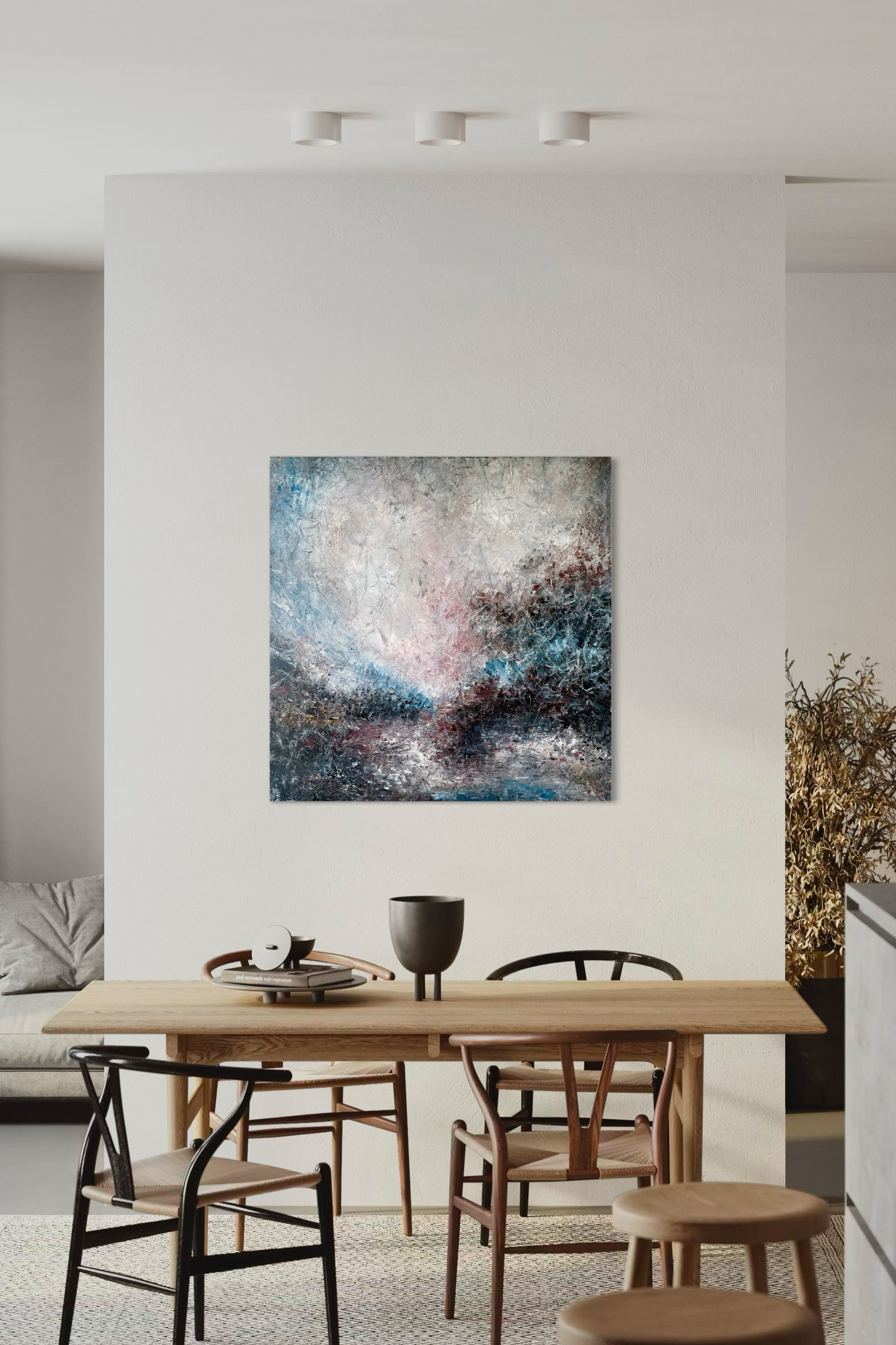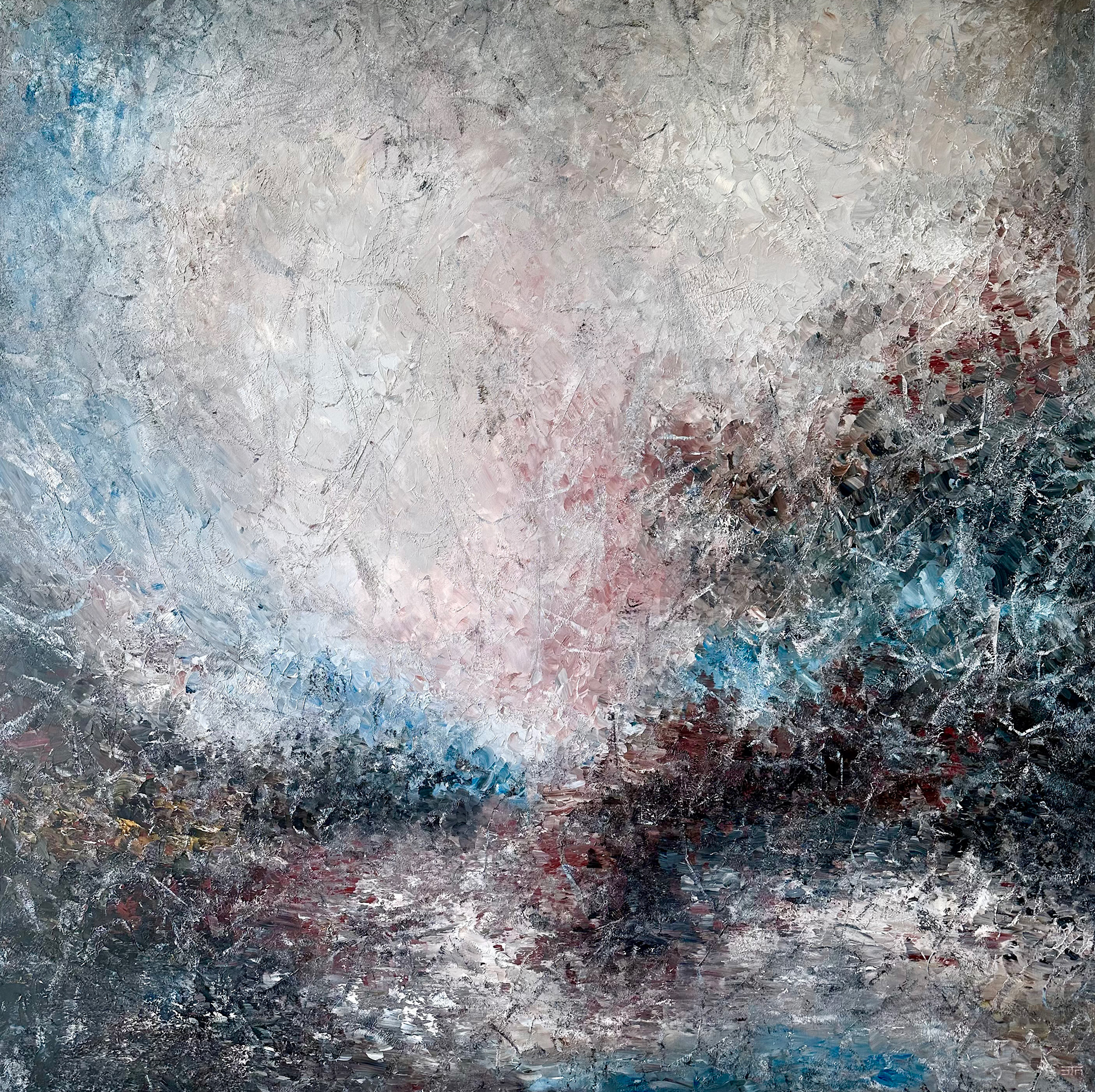Himmel og hav smelter sammen i et sitrende udbrud. Grå, blå og rosa nuancer blandes som drivende fronter, mens grove strøg og taktile lag river i motivet. Vinden har taget fat, og stormen er sat fri. Kaos og skønhed i stormens første åndedrag.