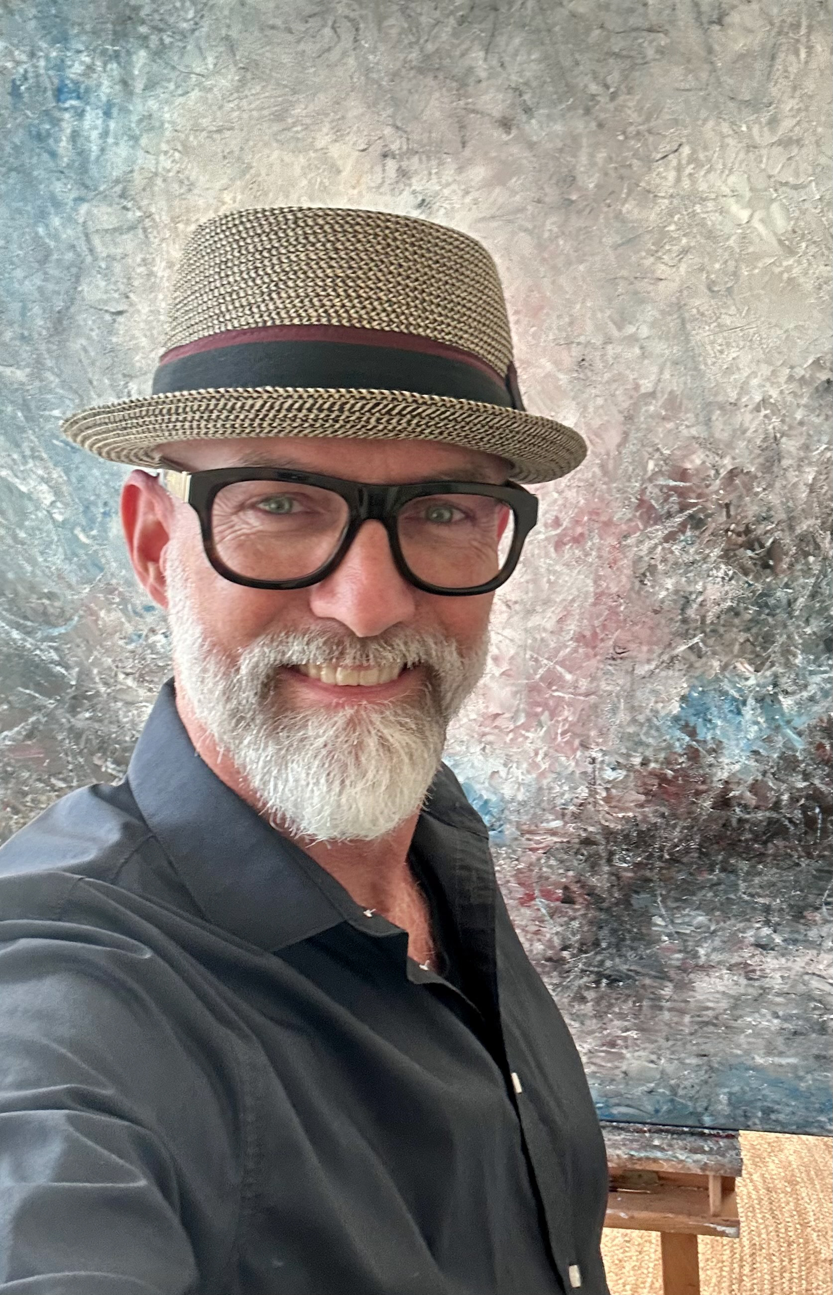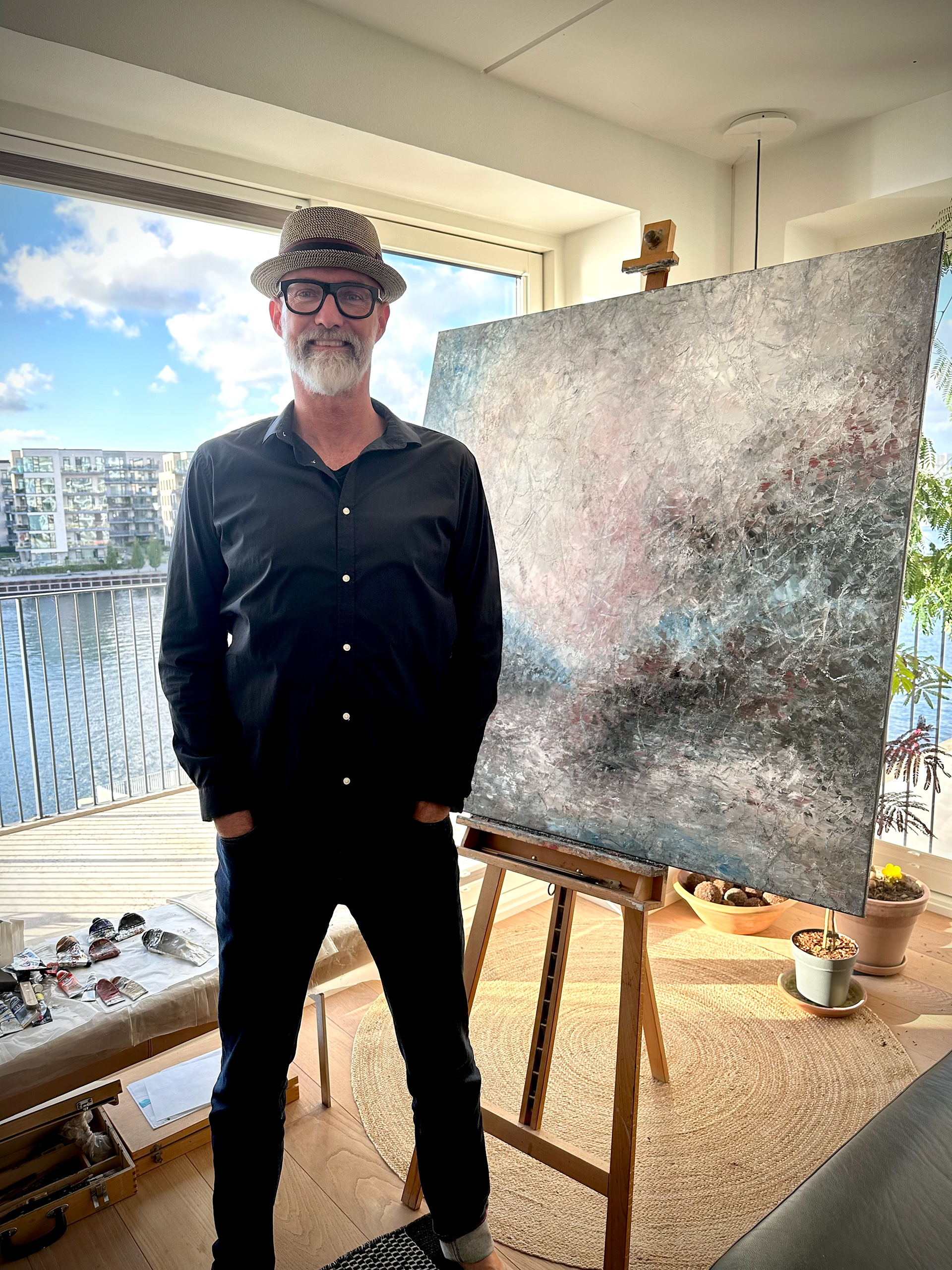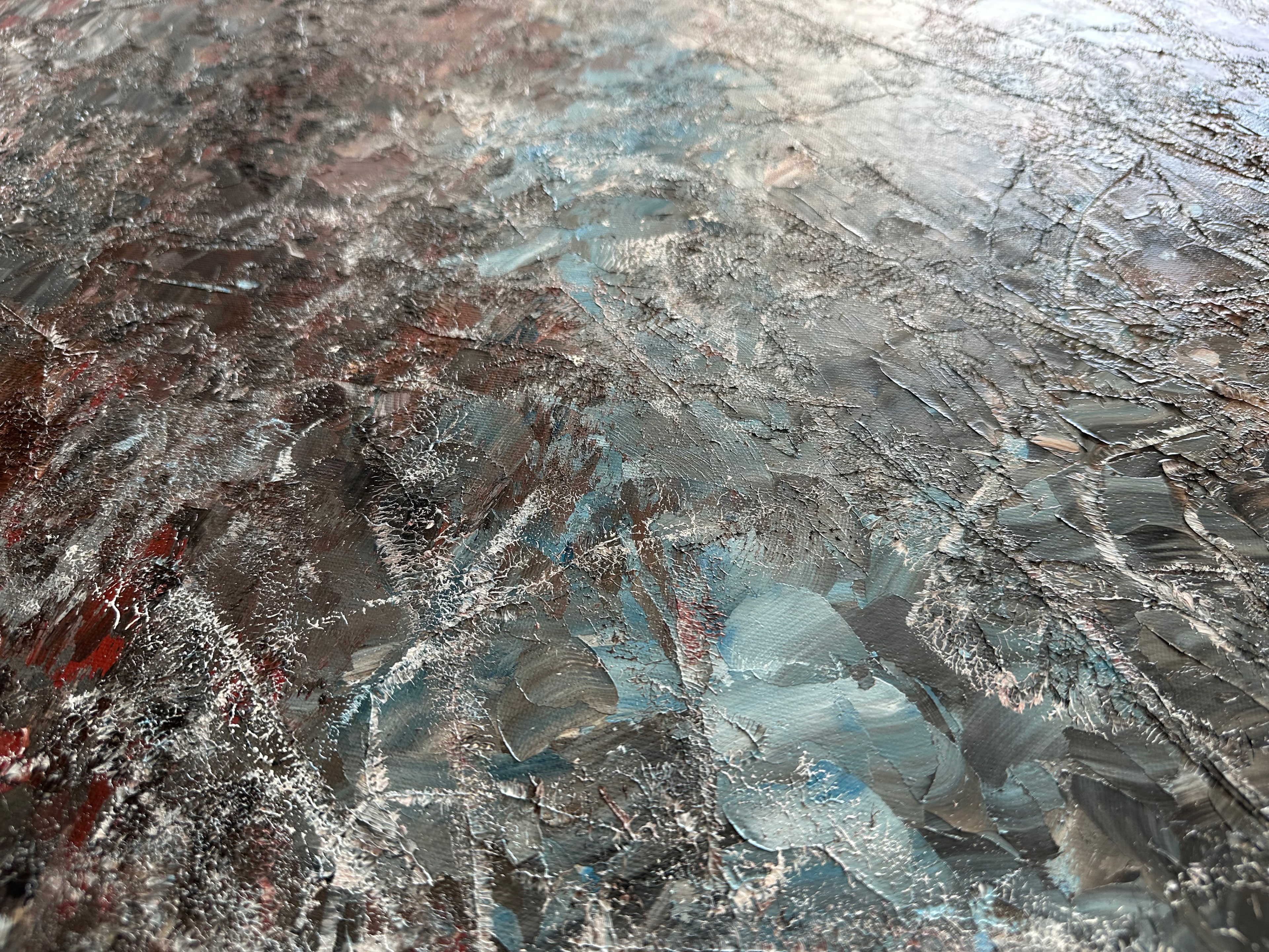 Himmel og hav smelter sammen i et sitrende udbrud. Grå, blå og rosa nuancer blandes som drivende fronter, mens grove strøg og taktile lag river i motivet. Vinden har taget fat, og stormen er sat fri. Kaos og skønhed i stormens første åndedrag.