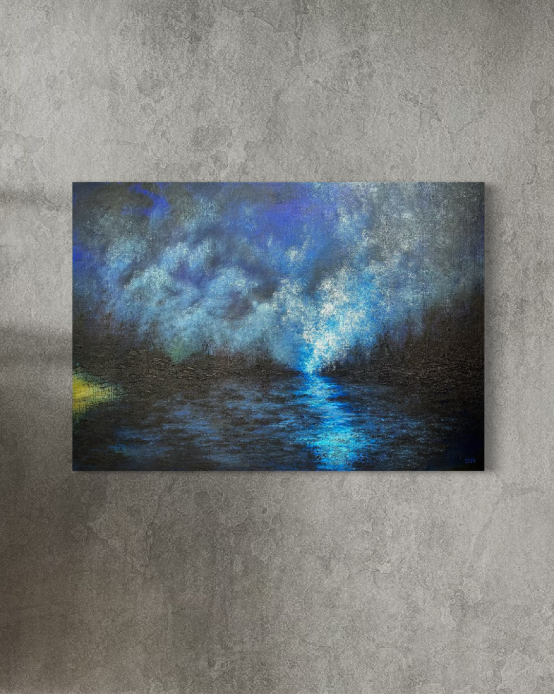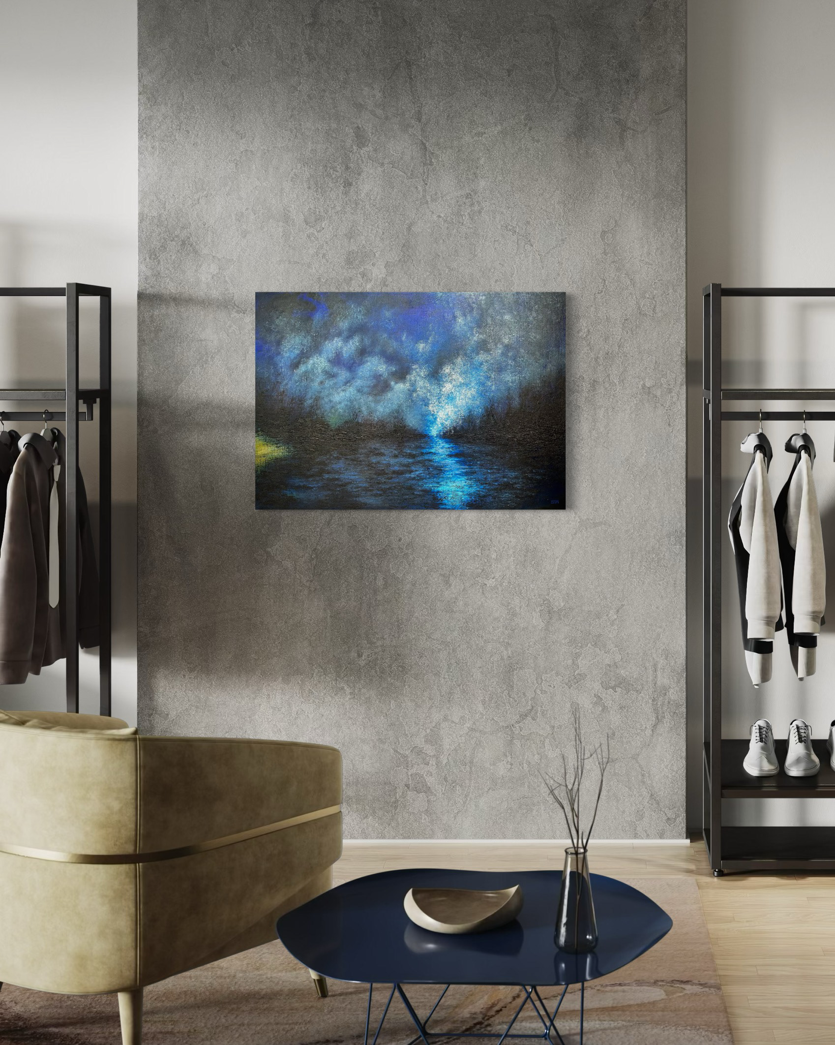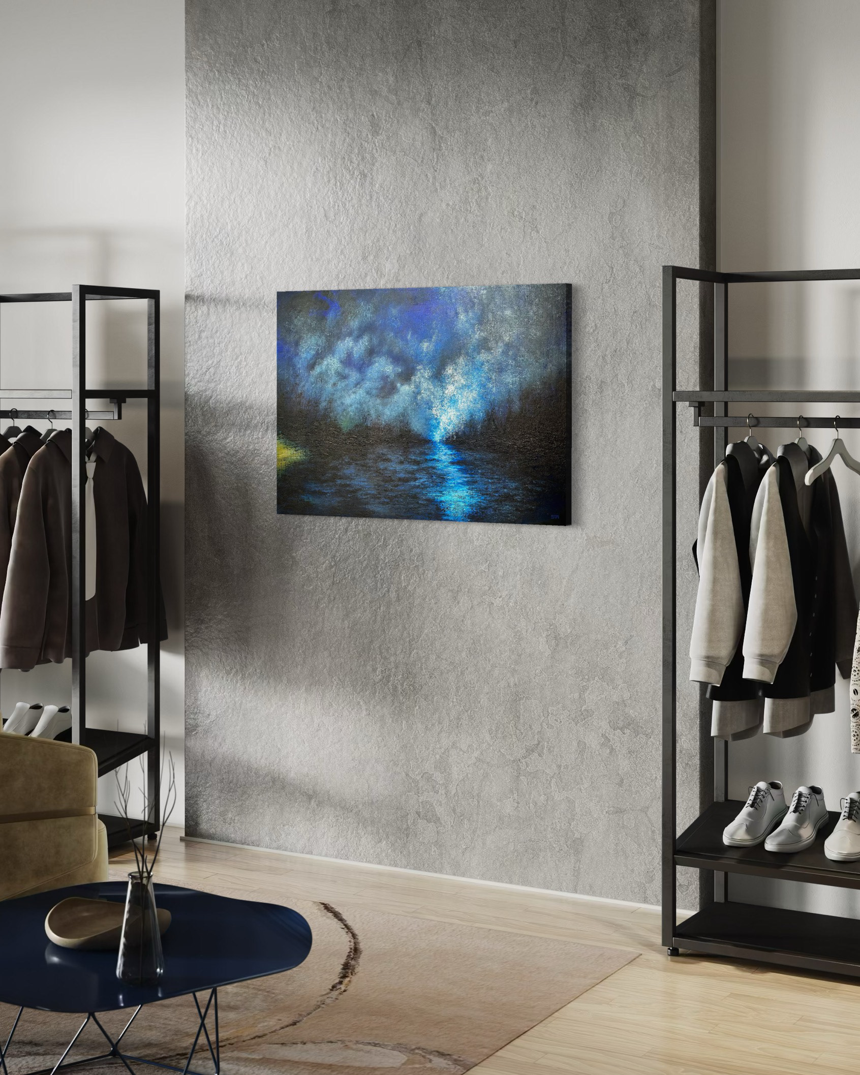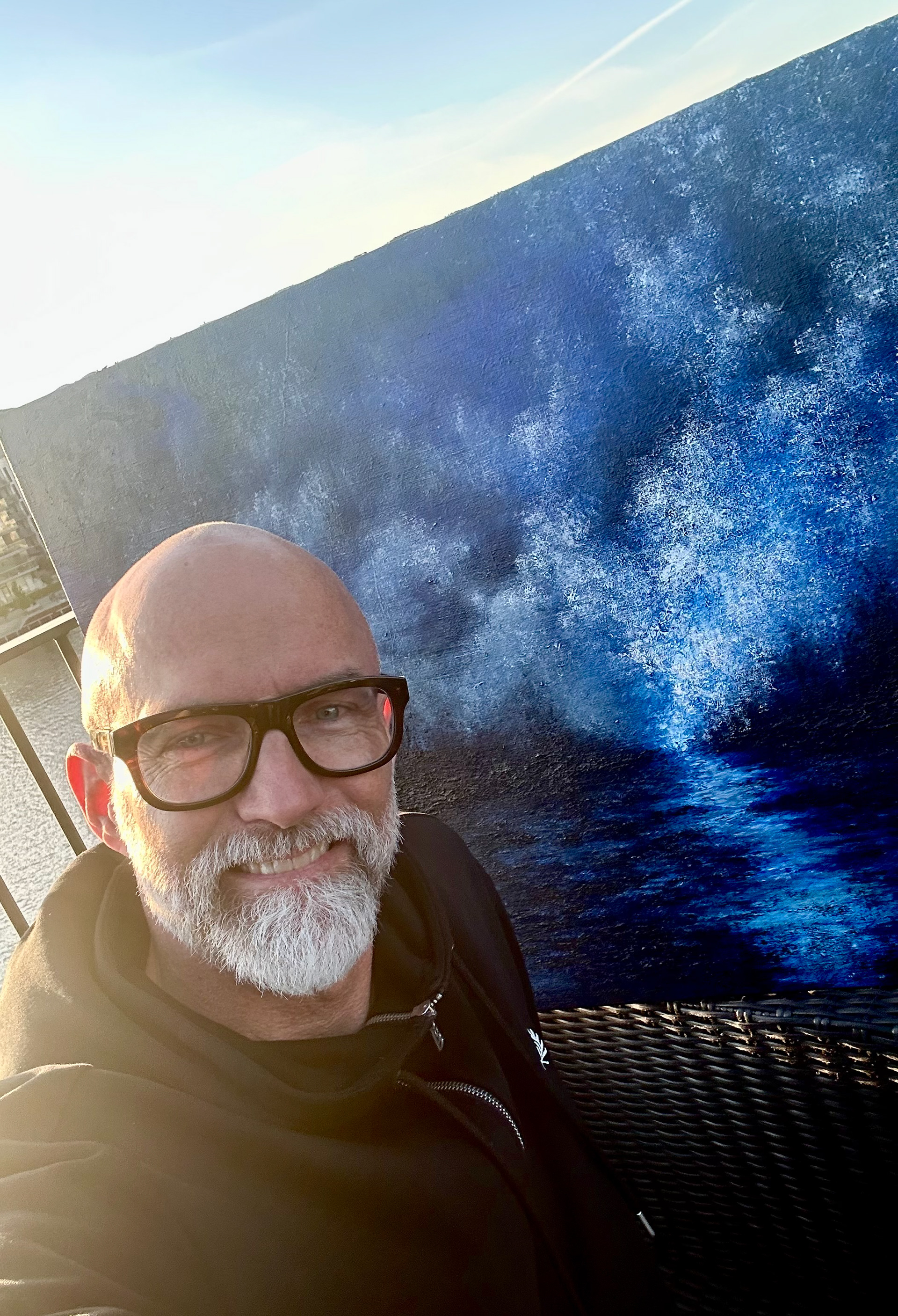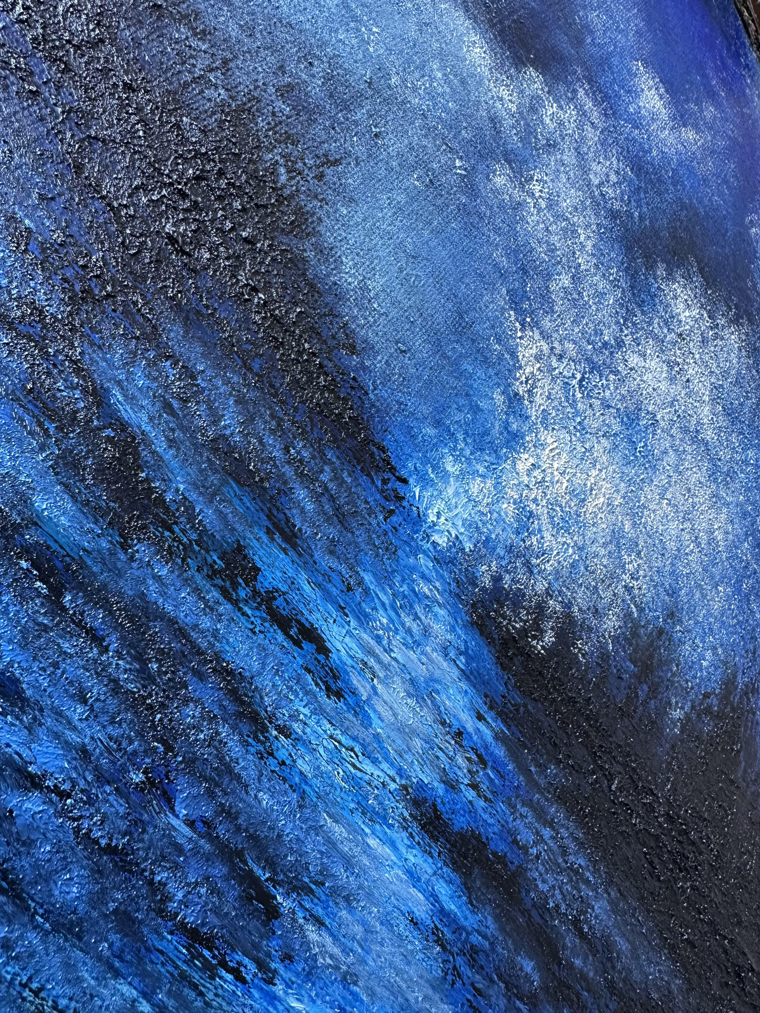 Blå toner smelter sammen i himmel og hav. Refleksioner i bevægelse, som tanker i stilhed. Et eftertænksomt øjeblik i et uendeligt blåt.