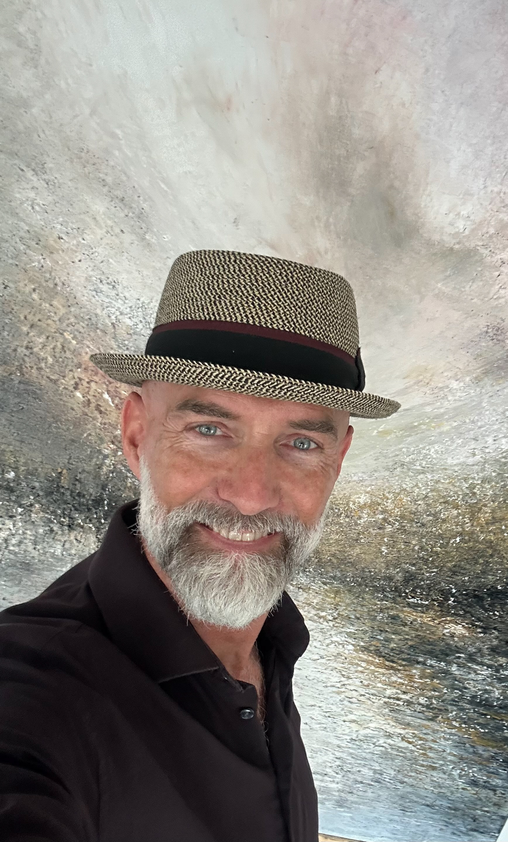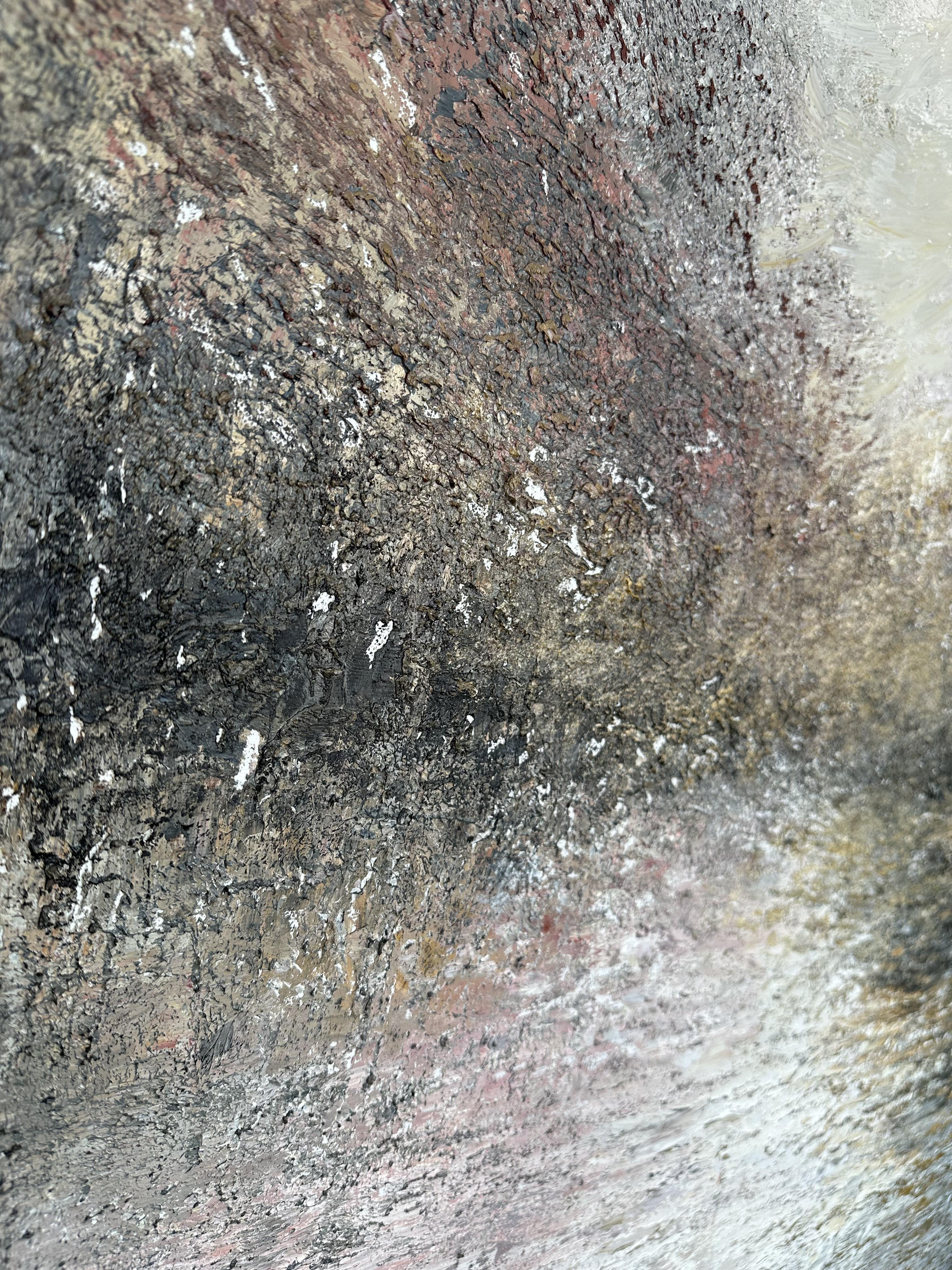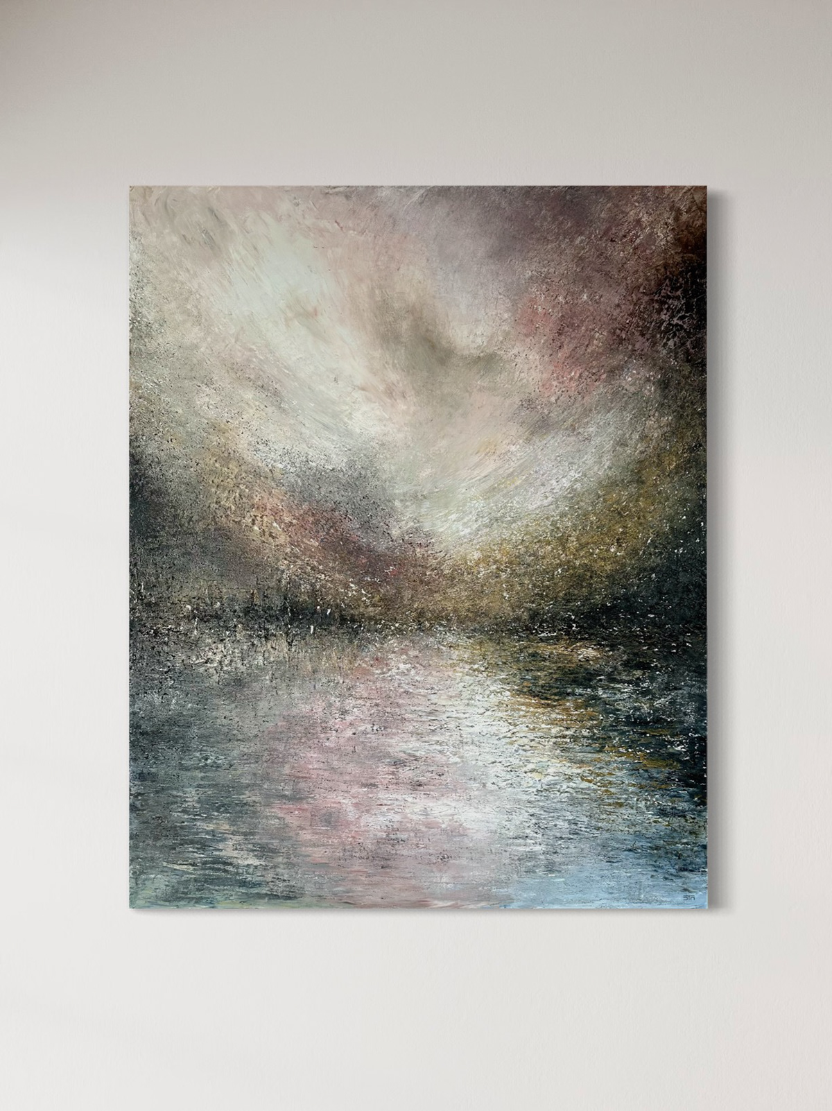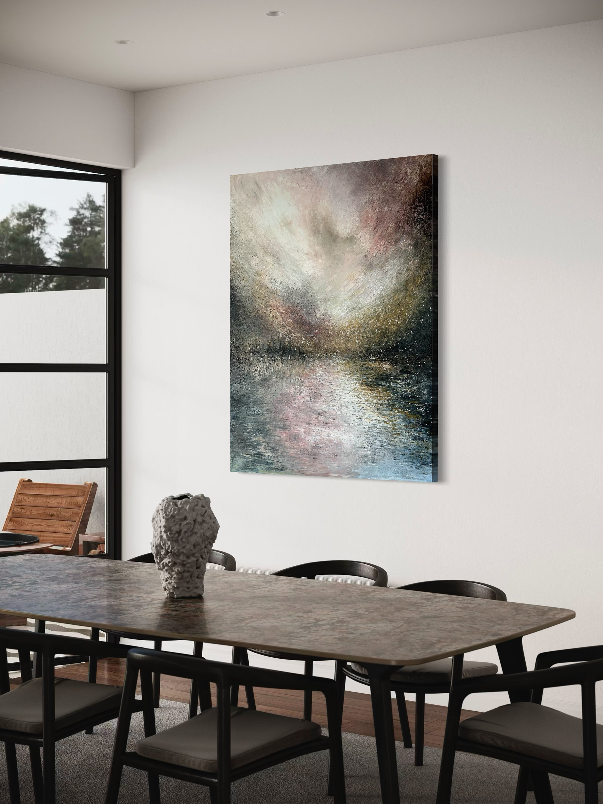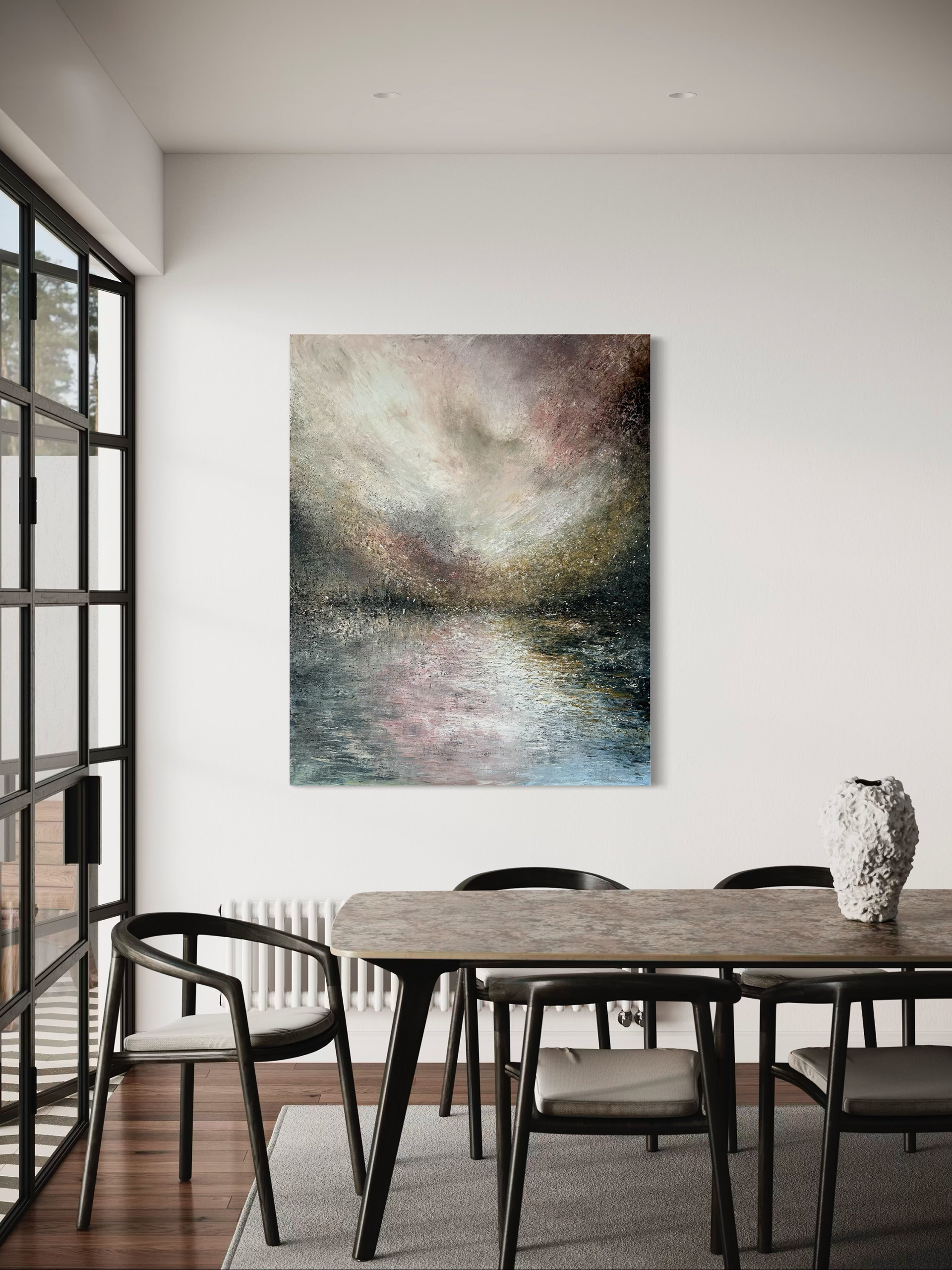 Et stort maleri, hvor ro og uro mødes. Vandet er stille, men himlen brænder af dramatisk skift. Som et varsel om det, der er på vej – en kraft, der ikke længere kan holdes tilbage.